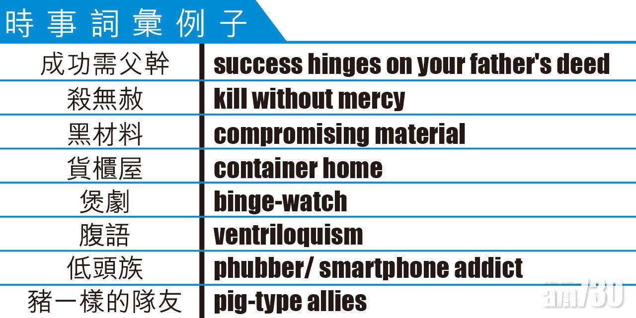 殺無赦、成功需父幹,究竟點譯做英文?香港大學中文學院今年研發時事詞彙手機應用程式「Newssary」,將常見的時事詞彙以「中英對照」形式展現,至今已收錄近8,000個詞彙。研發團隊稱,同一個詞彙難免有多種譯法,最終會先尊重官方譯法,再考慮講者語境及節奏定奪。