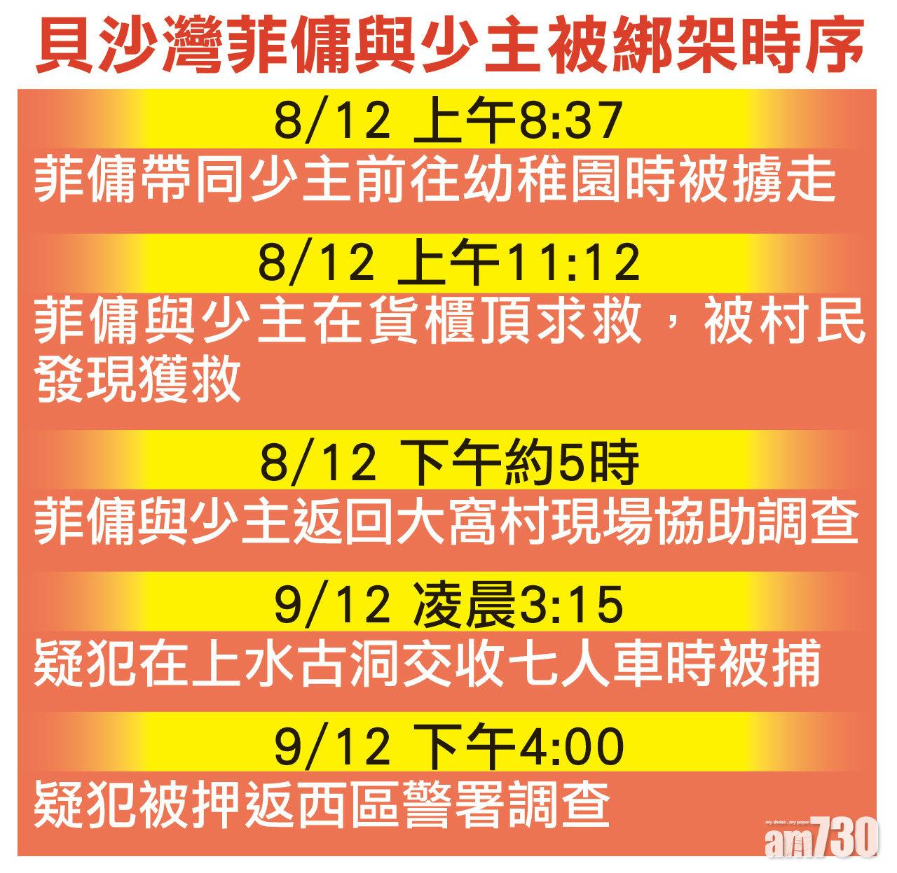 至同日上午11時12分,八鄉大窩村村民聽見村內一個布滿雜草的荒廢貨櫃頂上,傳來被綁架女傭呼喊聲,揭發案件報警求助。據了解,綁匪曾要求菲傭更衣、又以索帶綁起二人雙手及戴上頭套,外傭趁「睇水」綁匪離開貨櫃,自行鬆開索帶及頭套,攜同少主經冷氣機窗口爬到貨櫃頂求救。