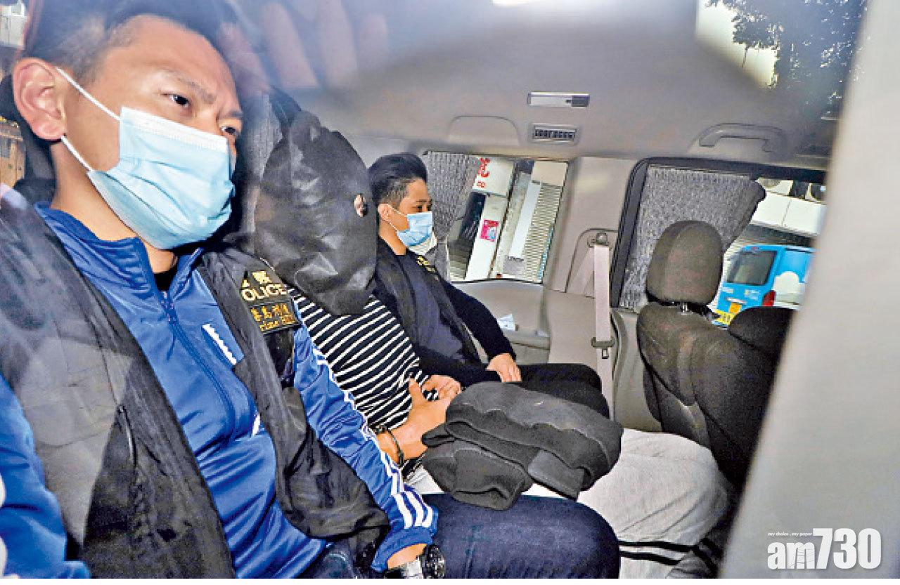 疑犯黑布蒙頭被警方帶走。(鍾式明攝)