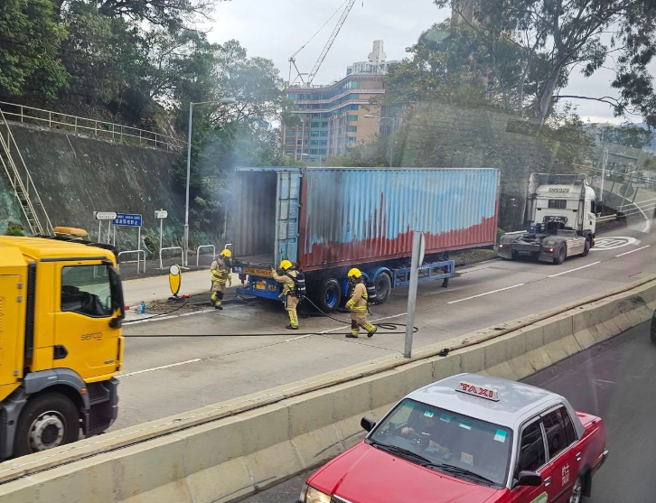 一輛貨櫃車沿獅子山隧道往九龍方向行駛,駛出管道後不久,車輛貨櫃突然起火冒煙。香港突發事故報料區