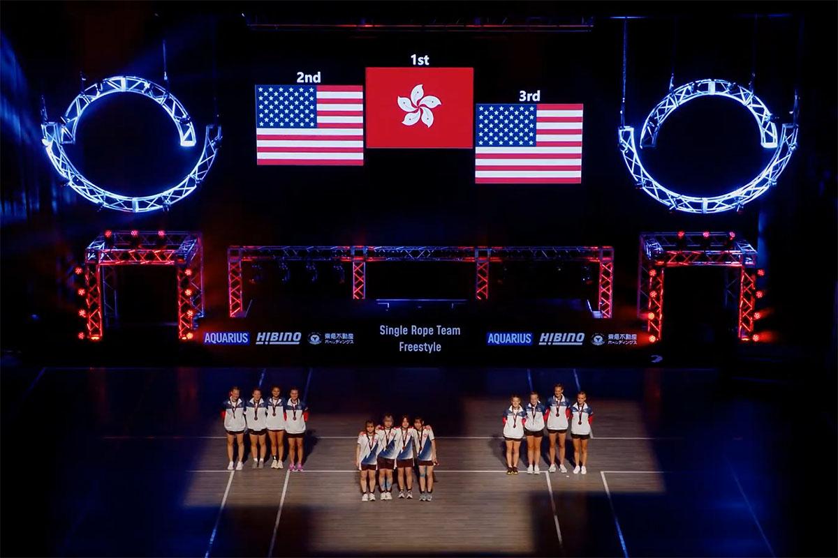 港隊出戰世界跳繩錦標賽決賽時,屏幕顯示的區旗被指與官方設計有數處出入。(世界跳繩錦標賽直播截圖)