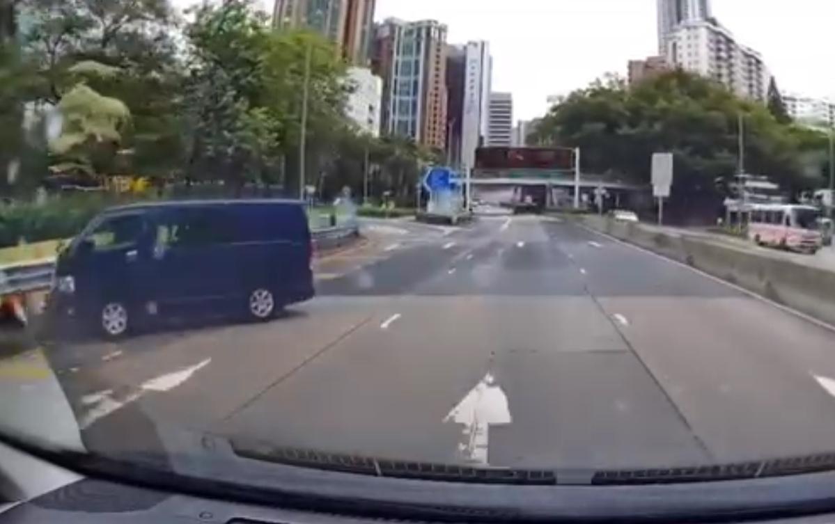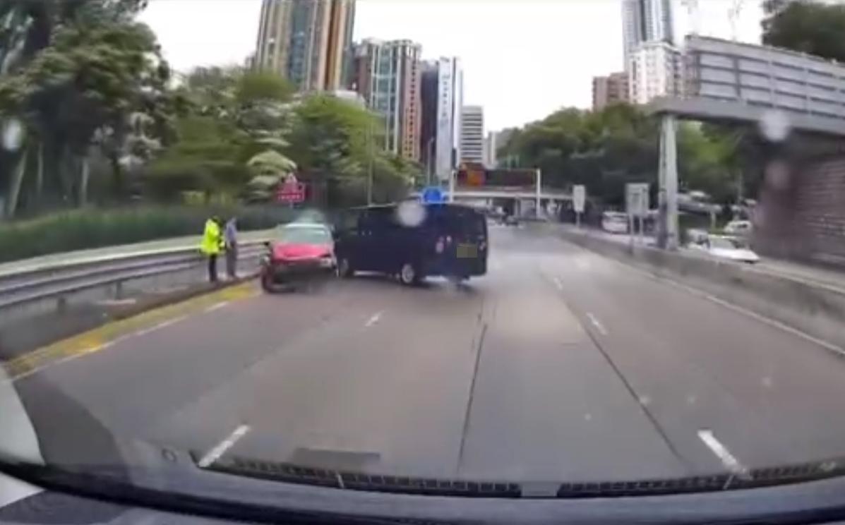 昨日(28日)下午近2時,從一段網上流傳的車Cam片段中可見,何文田公主道一輛的士懷疑自炒停泊在慢線路旁,車頭凹陷損毀,一名相信是司機的男子和一名交通警員亦站在的士旁邊進行調查。豈料,一輛落斜的客貨車駛至,突然,失控跣向左邊,越過中線,直撞向停慢線的士,更險些波及的士旁的司機及交通警,兩人均立即向後退。客貨車最後撞向路邊鐵欄始停下;路牌亦受波及,被撞至傾斜。