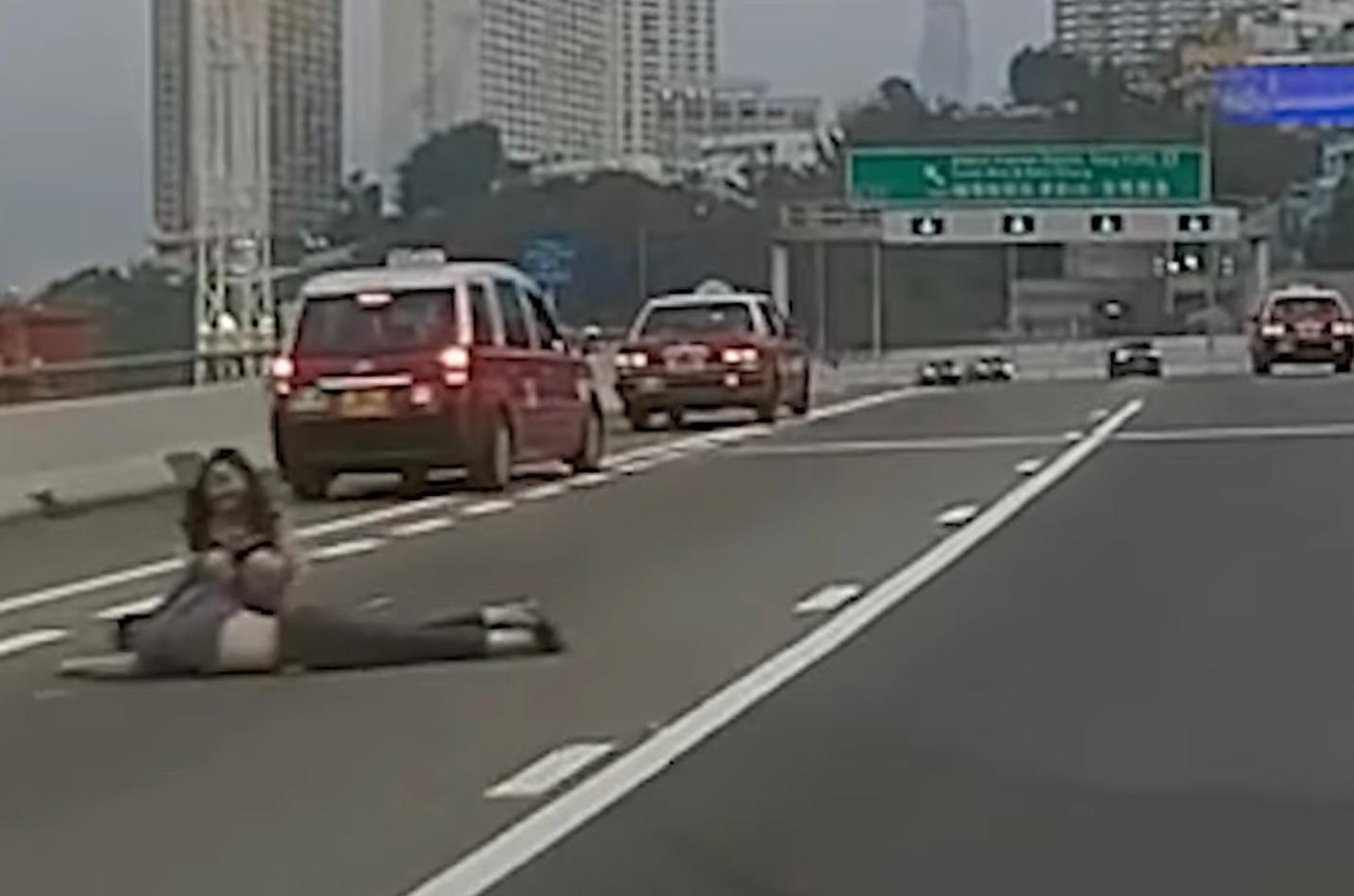 情侶吵架港男青葵公路跳車嚇哭女友,的士司機冒險指揮交通。(網上截圖)