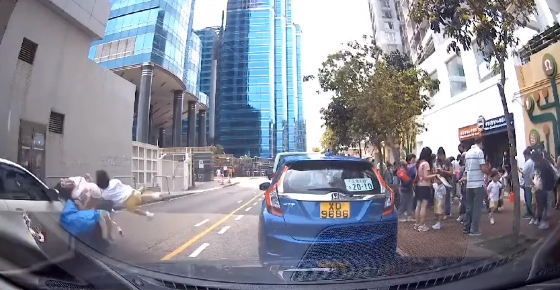 母親似乎因進退兩難,只好在電光火石間將兩名子女拉到自己身前,並立即轉身背向跑車,以肉身為子女阻擋,「硬食」跑車高速而來的撞擊力。惟撞擊力之大,令3人一同向前拋飛一米多墮地,其間女子堅握子女雙手,其中一名子女疑似受驚立即跑回母親身邊緊抱母親。
