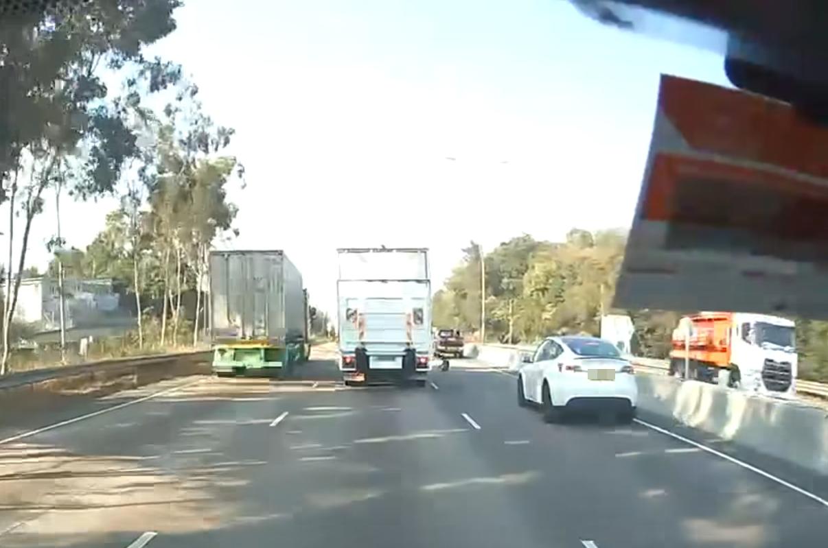 今日(6日)早上9時許,新田公路往逢吉鄉方向有3車相撞,包括兩輛私家車及一輛貨車。根據車cam片段顯示,一輛白色貨車打死火燈停在路面,前方有一隻狗狗正在橫過馬路。惟快線一輛農夫車疑撞到狗狗後不顧而去,狗狗被撞倒後立即起身,疑受傷跛腳在原地彈跳。後來居至的Tesla避狗減速,但後方另一輛七人車收制不及,先撞向白色私家車,再向左反彈撞到中線的白色貨車,其後該狗狗沿右側分隔石壆跑走,片段至此完結。警方表示,車禍涉及兩輛私家車及一架16噸貨車,意外中無人受傷。