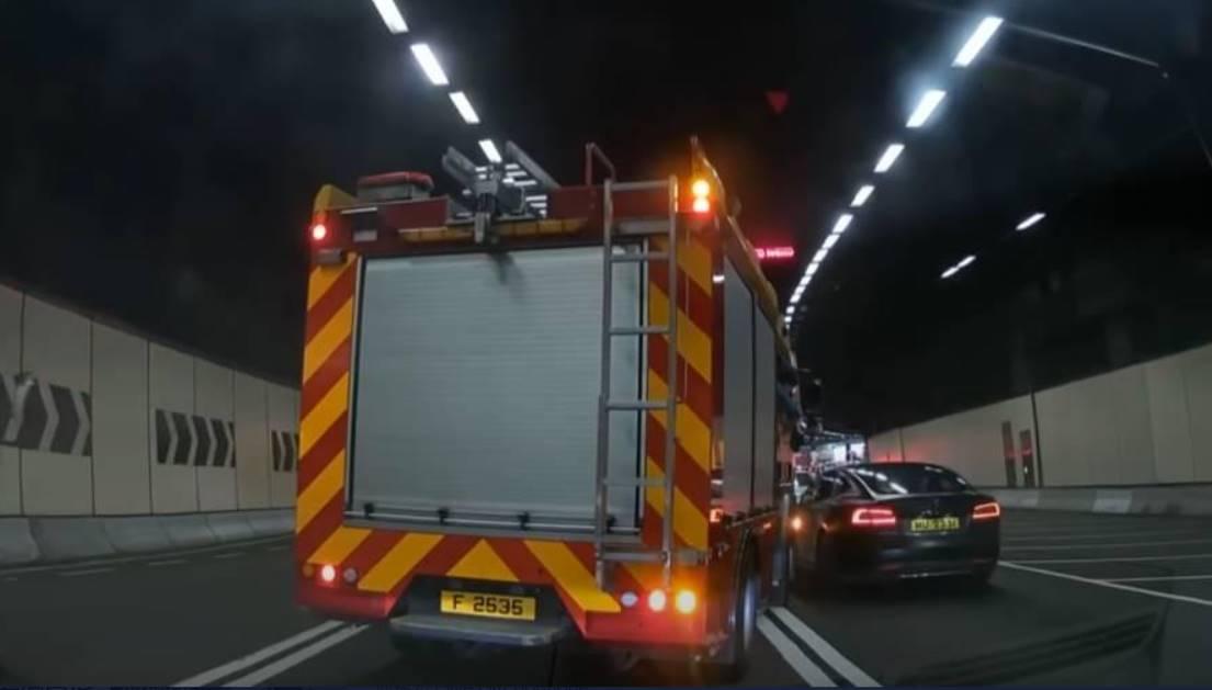 消防西隧趕救「學牌」鐵騎士Tesla拒讓,38歲司機被檢控。(影片截圖)