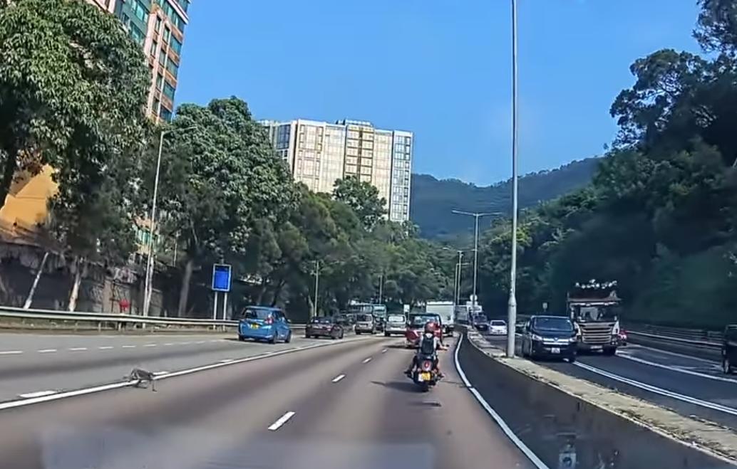 社交平台流傳一段車Cam片段,該段片段的拍攝時間為今日(6日)早上8時36分,當時片主駕車沿龍翔道快線往荃灣方向行駛,駛至星輝豪庭對開時,突然有一隻馬騮從由左一線橫越三條行車線快速衝向快線,司機疑被馬騮嚇到,驚呼一聲「呀!」,車頭一度有所搖擺,其後響咹示警,同時馬騮亦及時看到有車輛駛至,急停在左三線上,剛好與車輛擦身而過,片段就此結束。