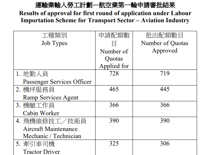運輸及物流局完成審批航空業輸入勞工計劃第一輪申請公布結果,28間公司中,共2,841個配額獲批,涉及全部10個容許輸入的工種,佔計劃6,300個配額上限的45%。