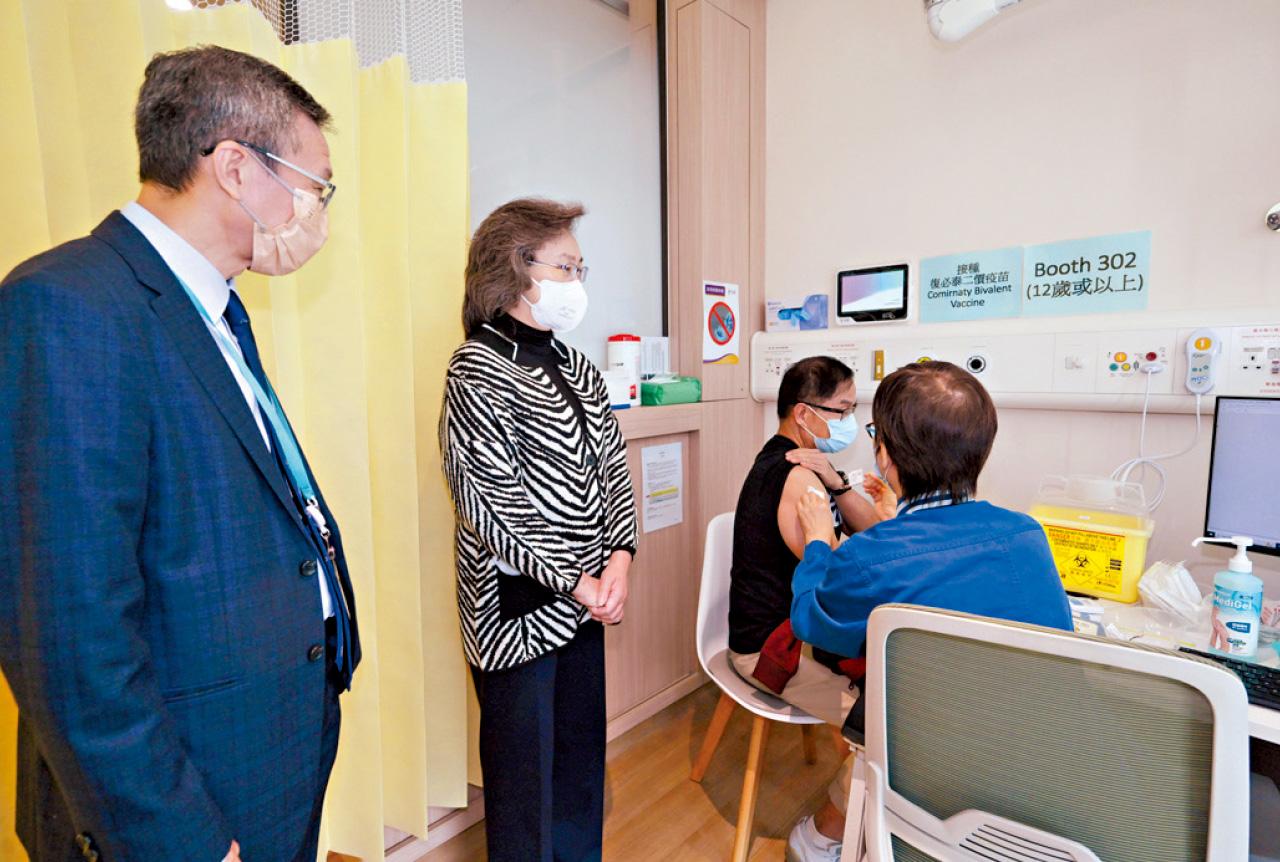 統籌疫苗計劃的公務員事務局長楊何蓓茵(左二),昨視察市民接種復必泰二價疫苗的情況。(政府新聞處)