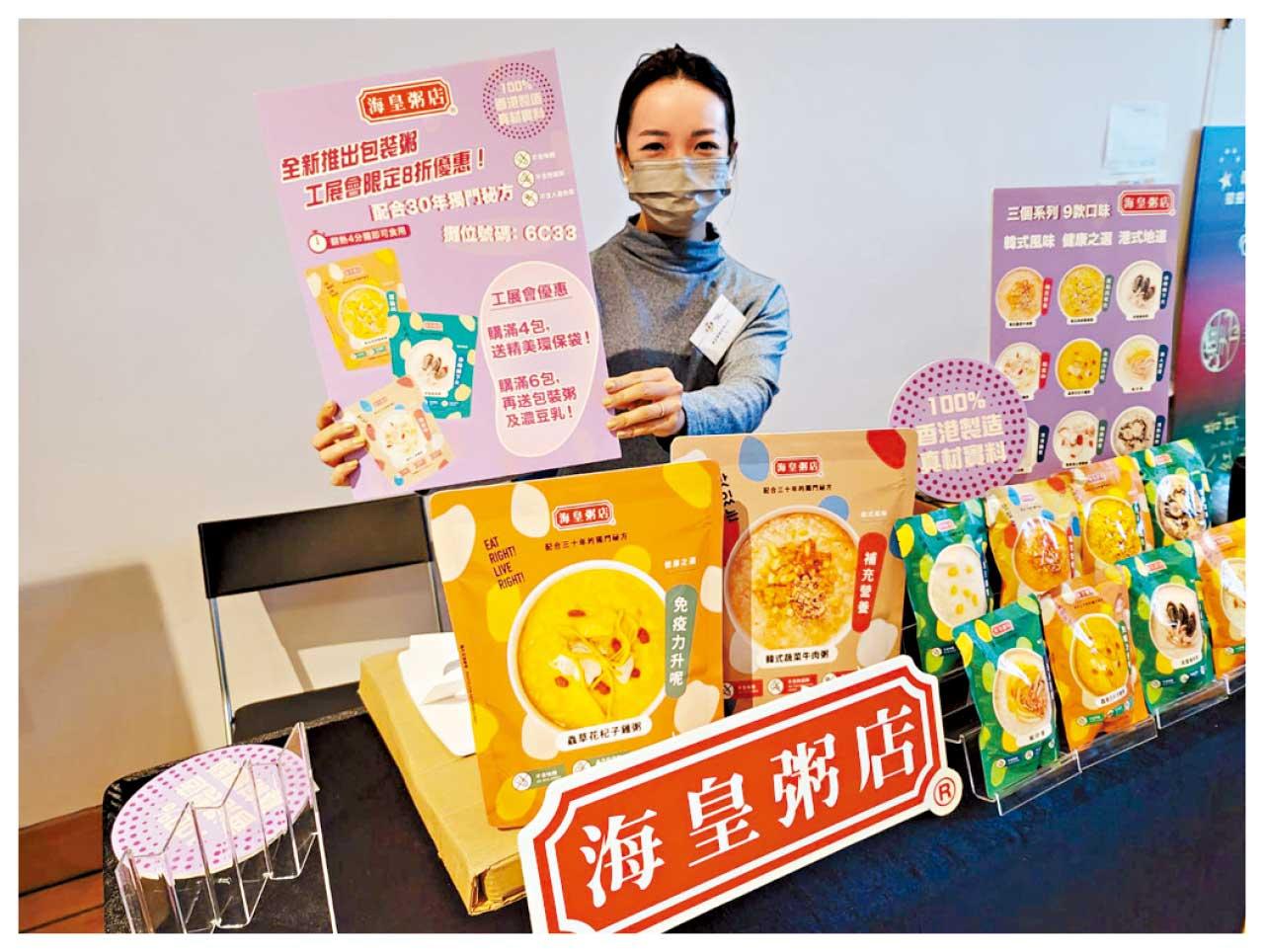 參展商對工展會銷情充滿信心。海皇粥店30周年,多年來首次參加工展會,首推包裝粥,業務發展及市場經理謝真敏表示,因疫情研發產品,趕及工展會前面世,她不認為太遲開發加熱食品已失疫下「居家自煮」商機,料市民習慣外賣回家食飯,又希望把30年獨門秘方送到市民家中,加上節慶旺季市民辦年貨,對銷情樂觀,料「包裝粥」生意額可達5位數。賣消毒產品的「保雅潔」助理營運經理陳嘉儒指,市民不會因疫情完結便就不清潔消毒,而憑香港科研、香港製造、小孩安心、價錢相宜等優勢,有信心展期達50萬元目標生意額。
