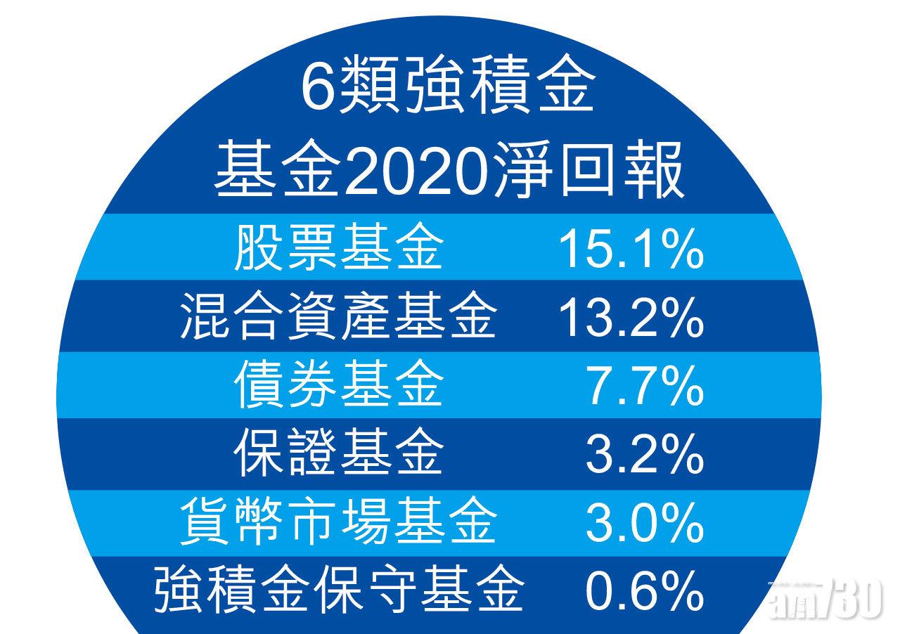 積金局指去年全部6類強積金基金都錄得正回報,其中股票基金回報率最高,達15.1%。混合資產基金及債券基金則位列第二及第三名,回報為13.2%和7.7%。強積金保守基金回報則最低,回報僅得0.6%。以回報增幅分析,債券基金升幅最高,按年增加3.5%。至於在預設投資策略裡,核心累積基金及65歲後基金去年回報分別為12.3%和8.8%。
