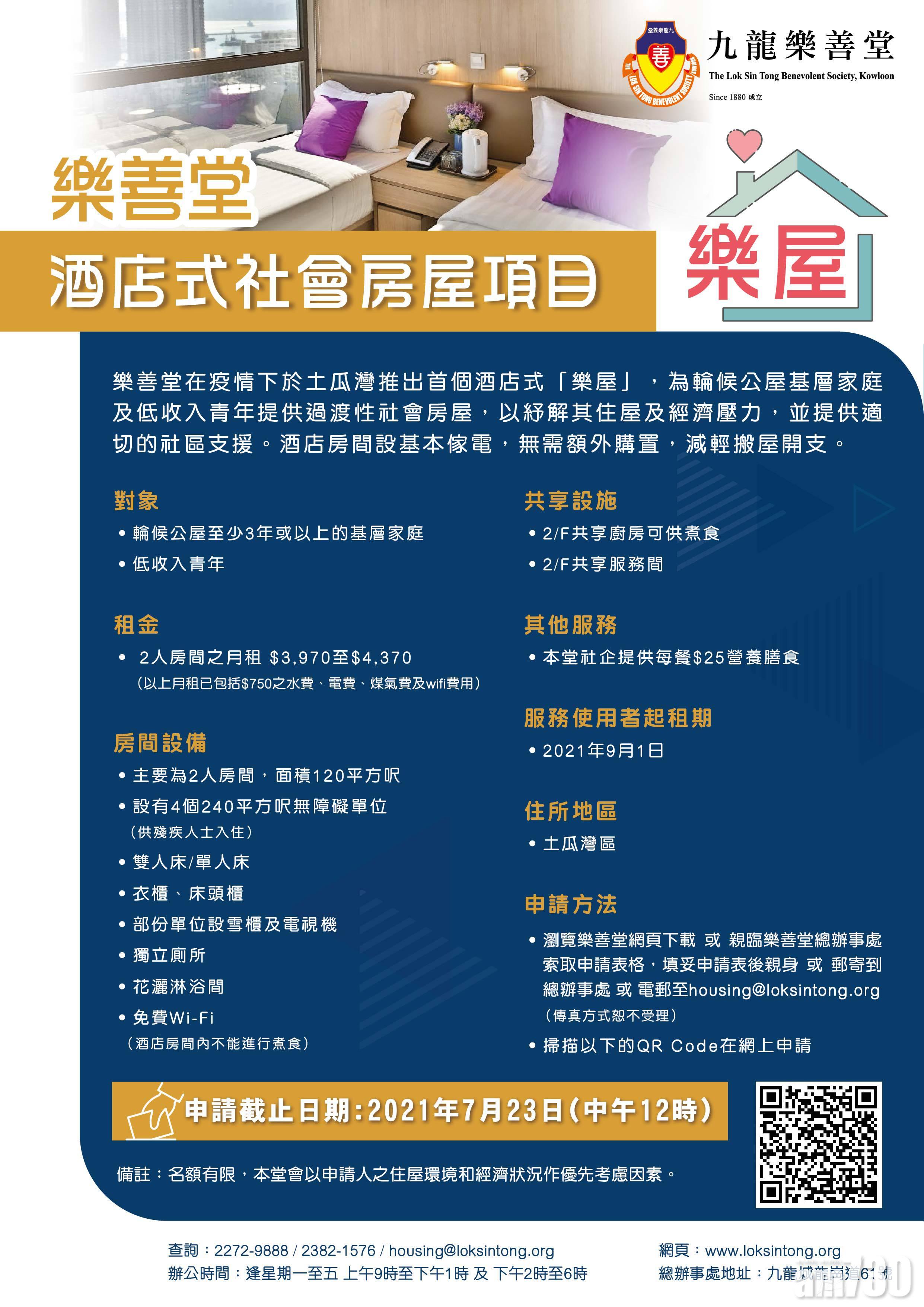 政府早前推出先導計劃,將入住率低的酒店及賓館改建成過渡房屋。樂善堂於土瓜灣推出首個酒店式過渡房屋「樂屋」,即日起至下月23日接受申請,申請資格為輪候公屋3年或以上基層家庭,以及低收入在職青年,截止日期為2021年7月23日中午12時。