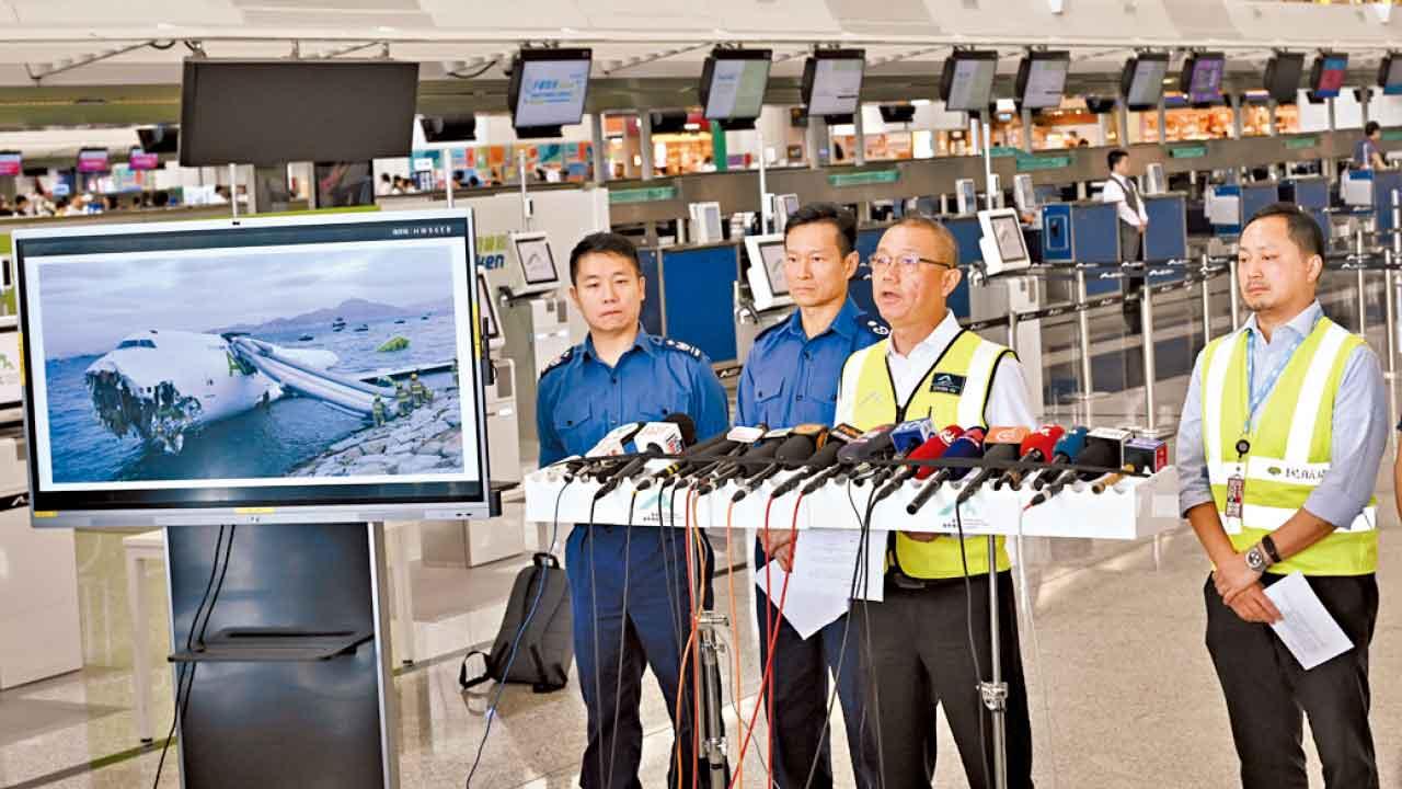 赤鱲角香港國際機場昨晨發生啟用以來首宗飛機衝落海意外。一架由阿聯酋杜拜來港的無載貨貨機,在北跑道降落後疑失控衝出跑道墮海,期間將一輛機場保安公司巡邏車撞落海,車上兩人最終不治,4名機組人員則無大礙送院治理。民航處表示,指揮塔事前有給予正確降落指示,期間未有接獲機師求助,機管局就指被撞的巡邏車,當時在距離跑道一段安全距離的正常位置執勤。有專家形容意外罕見,要等待分析俗稱「黑盒」的飛行紀錄儀數據才能了解事故成因。攝影:鍾式明
