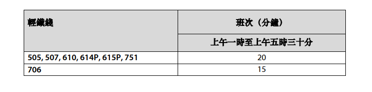 - 輕鐵線:505、507、610、614P、615P及751號線通宵服務每20分鐘一班;706號線通宵服務每15分鐘一班
