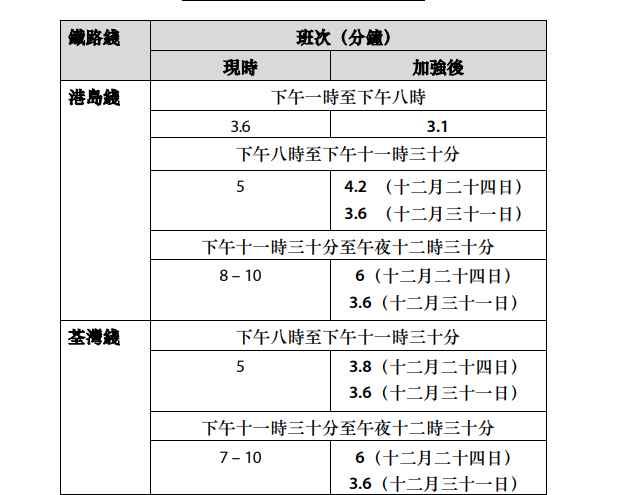 (i) 下列港鐵路線將於2023年12月31日晚上8時起加強服務,詳情如下: