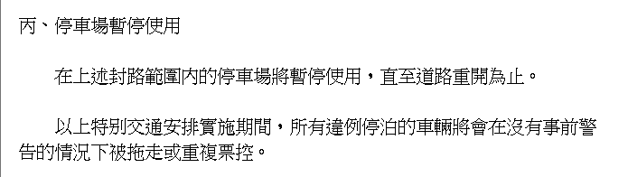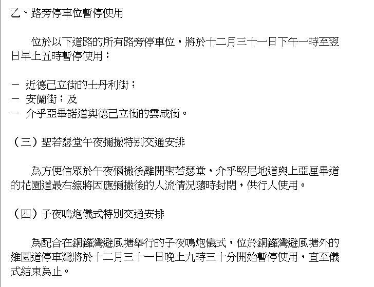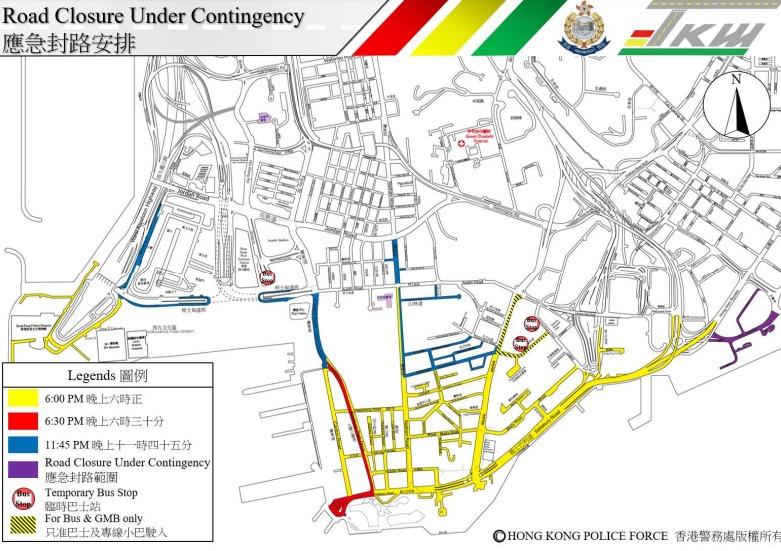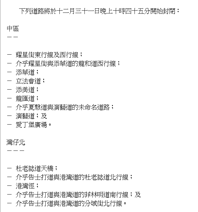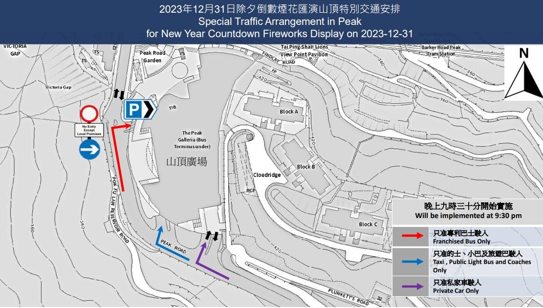 根據警方公布的除夕夜港九交通安排,西九龍當日傍晚6時起分階段封路,包括西九文化區及尖沙咀廣東道等一帶。至於港島區,在中區、東區及山頂等將分階段實施封路。其中灣仔金紫荊廣場一帶當晚7時起封路。中環蘭桂坊當日下午2時起至翌日凌晨5時將封閉。市民如要前往山頂,當晚9時半起,除居民及持有許可證人士外,未能進入山頂廣場人士需要折返。