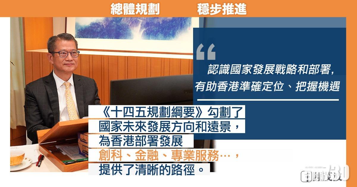 陳茂波指出,國家十四五規劃中,明確支持強化香港作為全球離岸人民幣業務樞紐、國際資產及風險管理中心的發展,稱加深認識國家發展大局和部署,有助香港更準確定位,更好把握內地發展的機遇。中央安排宣講團本周到港,通過多場會議向各界介紹《十四五規劃綱要》,特區政府未來會繼續加強對外宣傳,講解規劃綱要對香港發展的重要性。