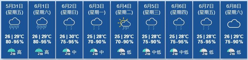 天文台展望明日有狂風驟雨及雷暴,雨勢有時頗大,離岸及高地間中吹強風。隨後一兩日仍有驟雨。天文台指,位於南海北部的熱帶氣旋會在今日逐漸靠近廣東西部沿岸,今明兩日該區會有狂風驟雨及雷暴,風勢較大。而西南氣流會在星期日為沿岸地區帶來驟雨。預料一股偏東氣流會在下周初至中期影響廣東沿岸。
