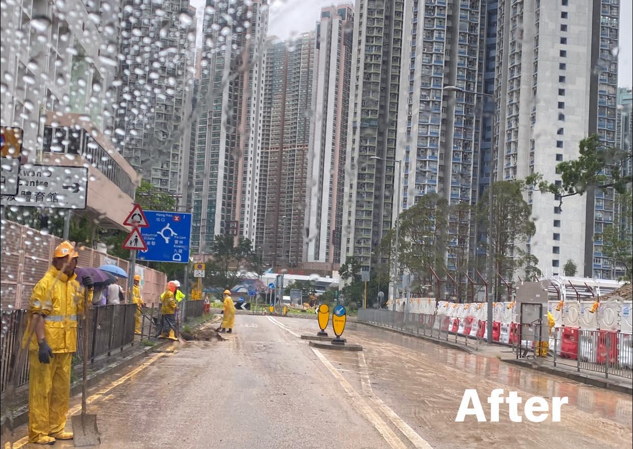 今日(9日)早上9時許,將軍澳坑口村對開一段影業路、集福路、出現水浸至小腿位置,影業路公營房屋工地的沙泥隨暴雨沖落馬路,瘀塞去水位。渠務署工人即時清理渠口排走積水,現時已回復正常行車。