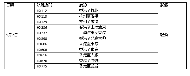 受颱風蘇拉影響,香港航空將取消9月1日至9月2日,逾30班航班,又表示因受臨時或計劃性的航班變動影響之乘客豁免更改座位、誤機、機票換開和退票費用,此措施僅適用於所有已獲取香港航空確認機位之機票。取消班次如下圖: