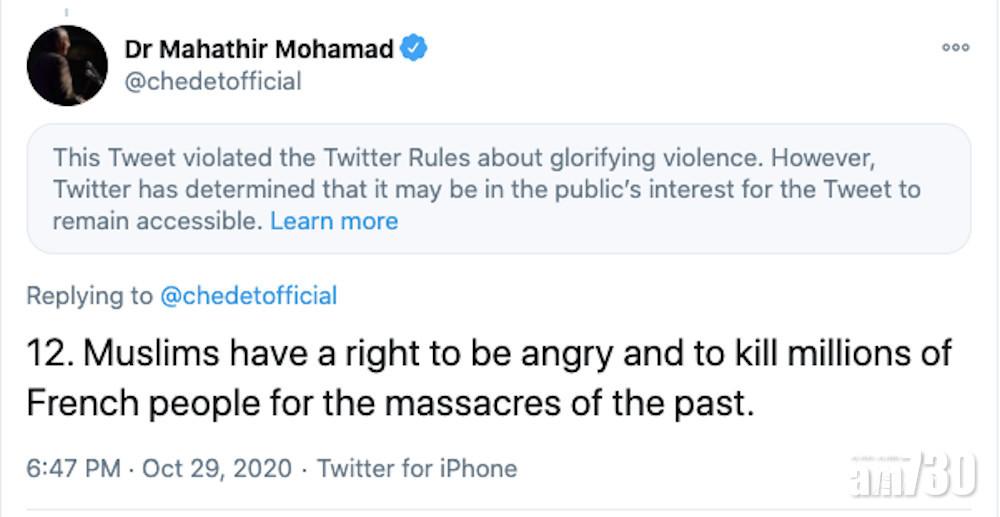 馬來西亞前總理馬哈蒂爾在法國尼斯發生恐襲後,在社交網站Twitter發帖文,指回教徒有權就以往的大屠殺事件而感到憤怒及殺害數百萬法國人。帖文其後被刪除。法國官員促Twitter立即暫停馬哈蒂爾的帳戶,否則會成為幫凶。