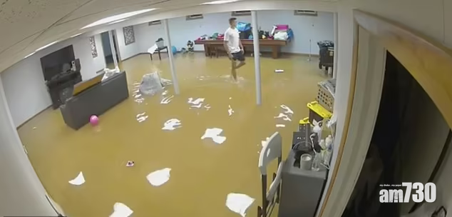 颶風艾達上周為美國東北部帶來豪雨,紐約市和鄰近的新澤西州水浸情況嚴重,新澤西一房屋的地下室攝錄機拍下洪水的兇猛。畫面可見地下室受水浸,水深及小腿,一名男子涉水走過,未幾牆壁被洪水沖破,水位暴漲至幾乎淹浸整個地下室。