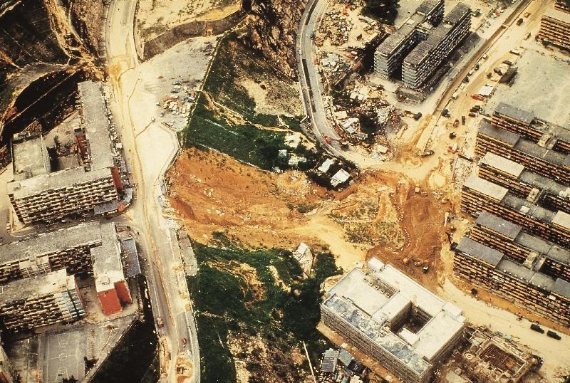 1972年六一八雨災,連日暴雨引發秀茂坪發生山泥傾瀉,沖毀大批木屋,造成71喪生的嚴重事故。(圖片來源:政府新聞處)