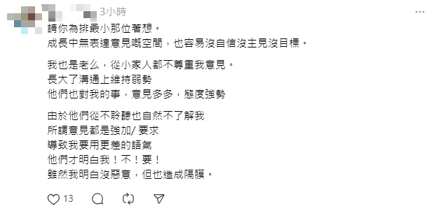 該五孩母在社交平台Threads發文,分享自己的小朋友相處和樂,不會出現鬥爭。方法就是讓年紀最大的小朋友揸主意,由上級管理下級,而其他弟妹因自出生以來都是按照此方法教養,所以弟妹不會有任何意見。她舉例,會先讓年紀最大的小朋友上車後先選擇座位,年紀最小的對此就不會有意見。