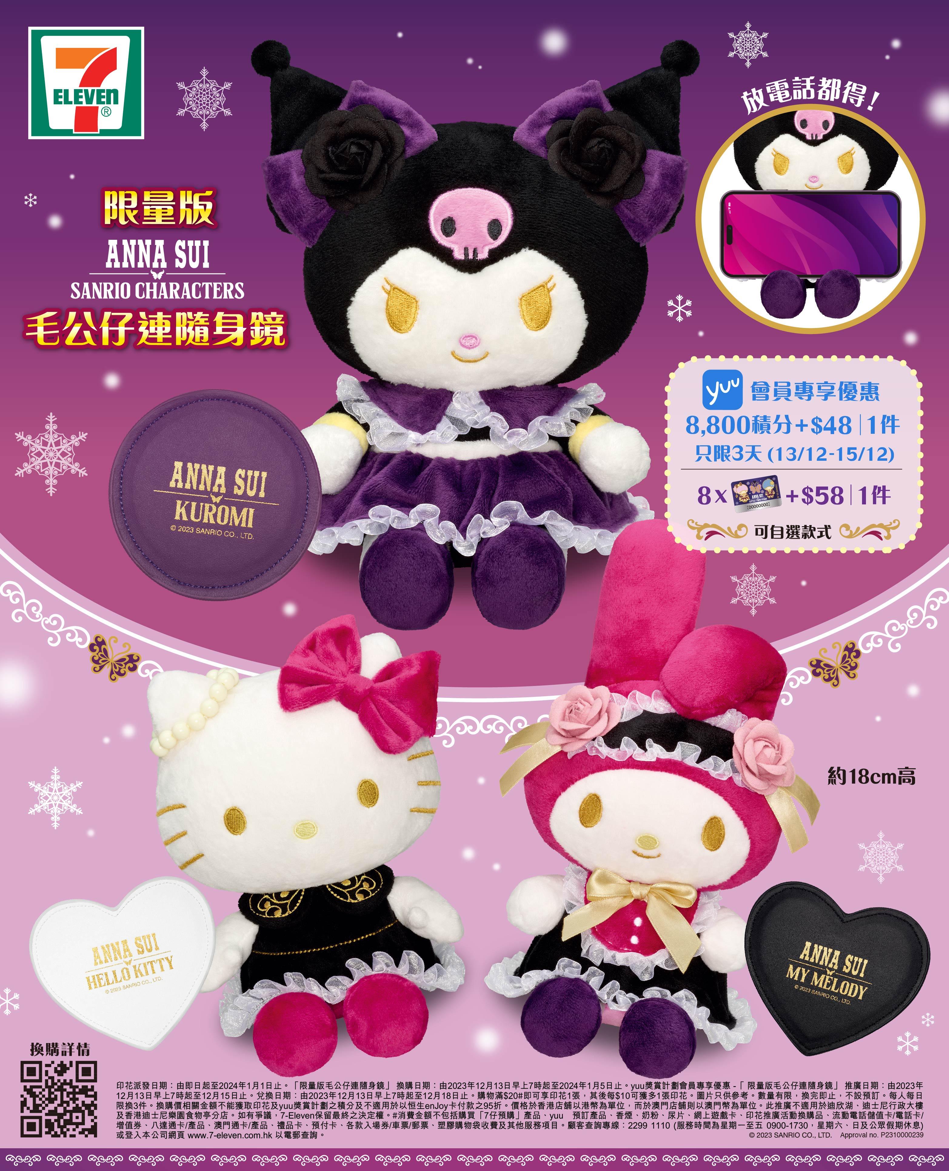 推廣日期:2023年12月13日起至2023年12月15日止。兌換日期為2023年12月13日早上7時起至2023年12月18日。以8,800 yuu 積分+$48,換購「ANNA SUI|Sanrio characters限量版毛公仔連隨身鏡」1件。顧客可自行挑選喜愛款式,每人每日限換3件,數量有限,換完即止。