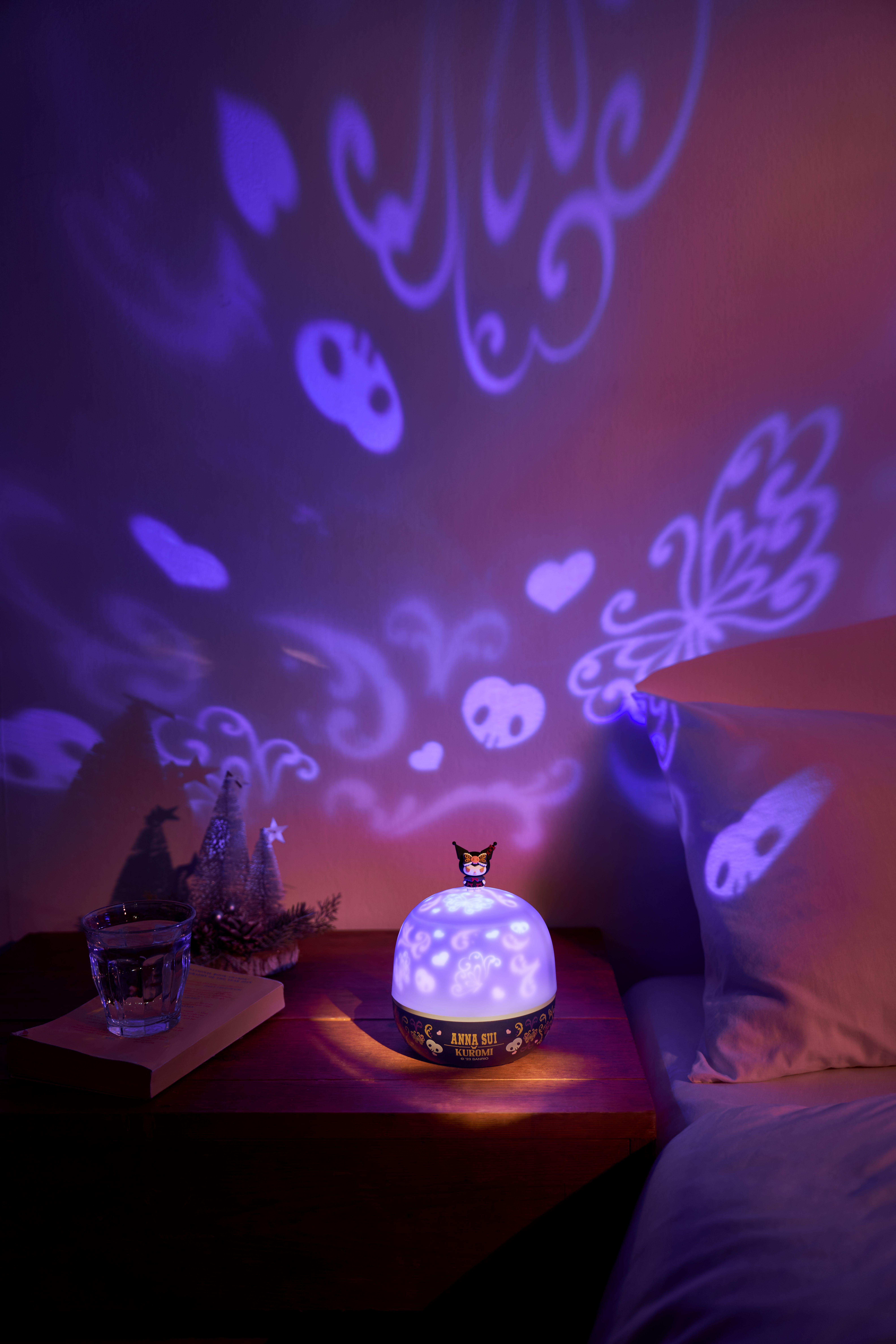 派對當然不能沒有燈光的點綴,這款3D公仔旋轉投影燈是派對必備好物!Kuromi 展現型格擔當的風範,變身成限量精品「Kuromi 3D公仔旋轉投影燈」,為你營造節日氣氛!於昏暗的環境下,開著立體公仔旋轉投影燈,便會投影出Kuromi 及 ANNA SUI標誌的蝴蝶、心形惡魔骷髏骨圖案,共有3種顏色及亮度可隨你切換,分別可顯示出白色、黃色及紫色的投影圖案。而且3D公仔旋轉投影燈能360度動態旋轉,更可換自己喜愛的投影燈片,以USB線充電,方便帶到派對當中, 增添一點氣氛!
