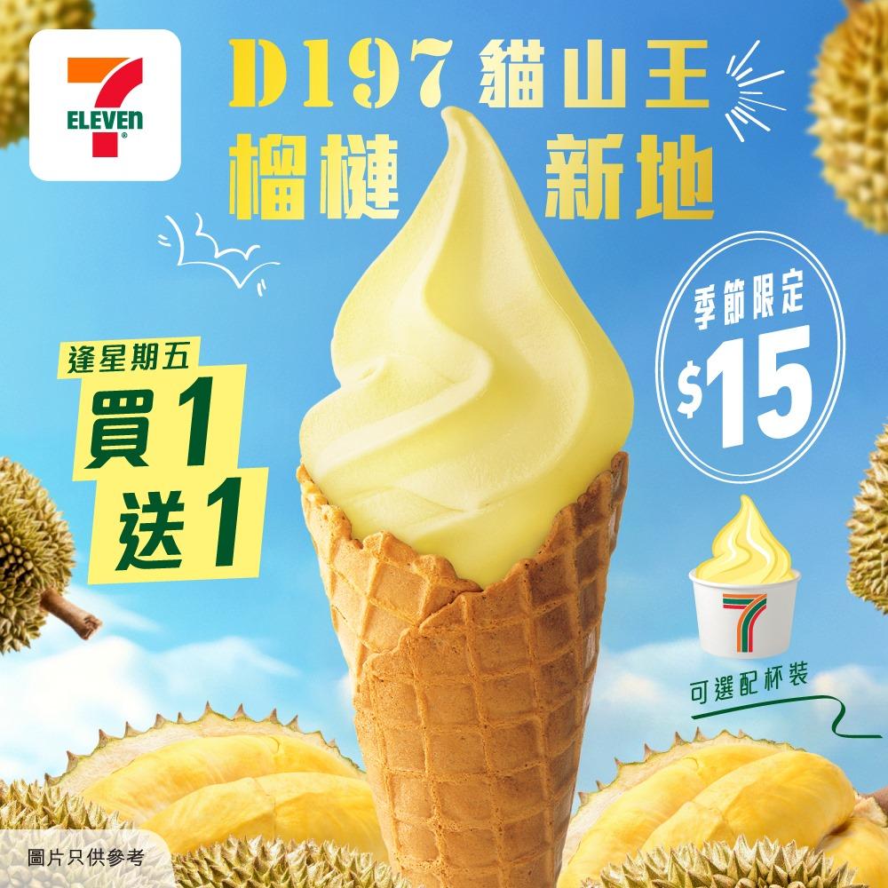 7-Eleven全新D197貓山王榴槤新地登場,由8月7日起,各位就可以於指定分店食到D197貓山王榴槤新地!來自馬來西亞遠道而來的新地味道,蘊藏香甜軟滑滋味,啖啖濃郁榴槤香味,令人一試難忘,原價一支$15。