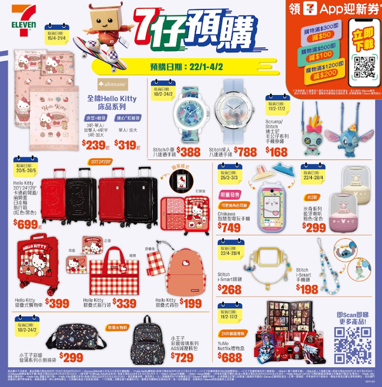 各位Chii粉絲注意!今期7仔預購推出超人氣 Chiikawa 智慧型電玩手機,隨時隨地都可以與Chiikawa角色互動。另外更有isney 角色史迪仔化身Stitch 八達通手錶,登陸7仔預購。同場加映全新 Hello Kitty 旅行用品系列以及小王子彩繪玻璃系列背包,即睇詳請。