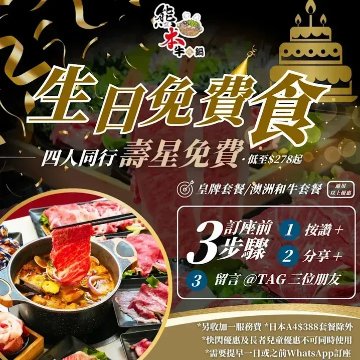 凡當月份生日的客人4人或以上同行,壽星即可免費享用皇牌套餐/澳洲和牛套餐(壽星需支付正價加一服務費),餐廳更免開瓶費及免切餅費!