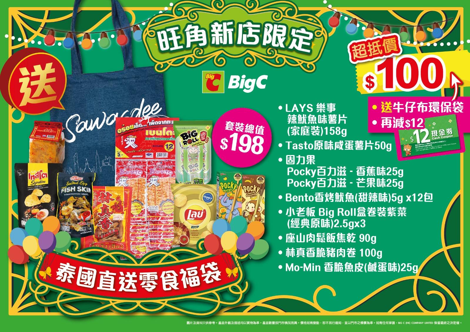 除此以外,Big C為了配合新店開幕及農曆新年到來,特別推出新店優恵以饗顧客。凡以低至88元(44折)的價錢,就能購買「日日食得好套裝」或以210元(45折)購買「泰國直送零食福袋」或「Pinnara美顏套裝」。享有多款泰國獨特貨品,顧客即便消費剛滿50元,也可獲贈新張誌慶禮物。