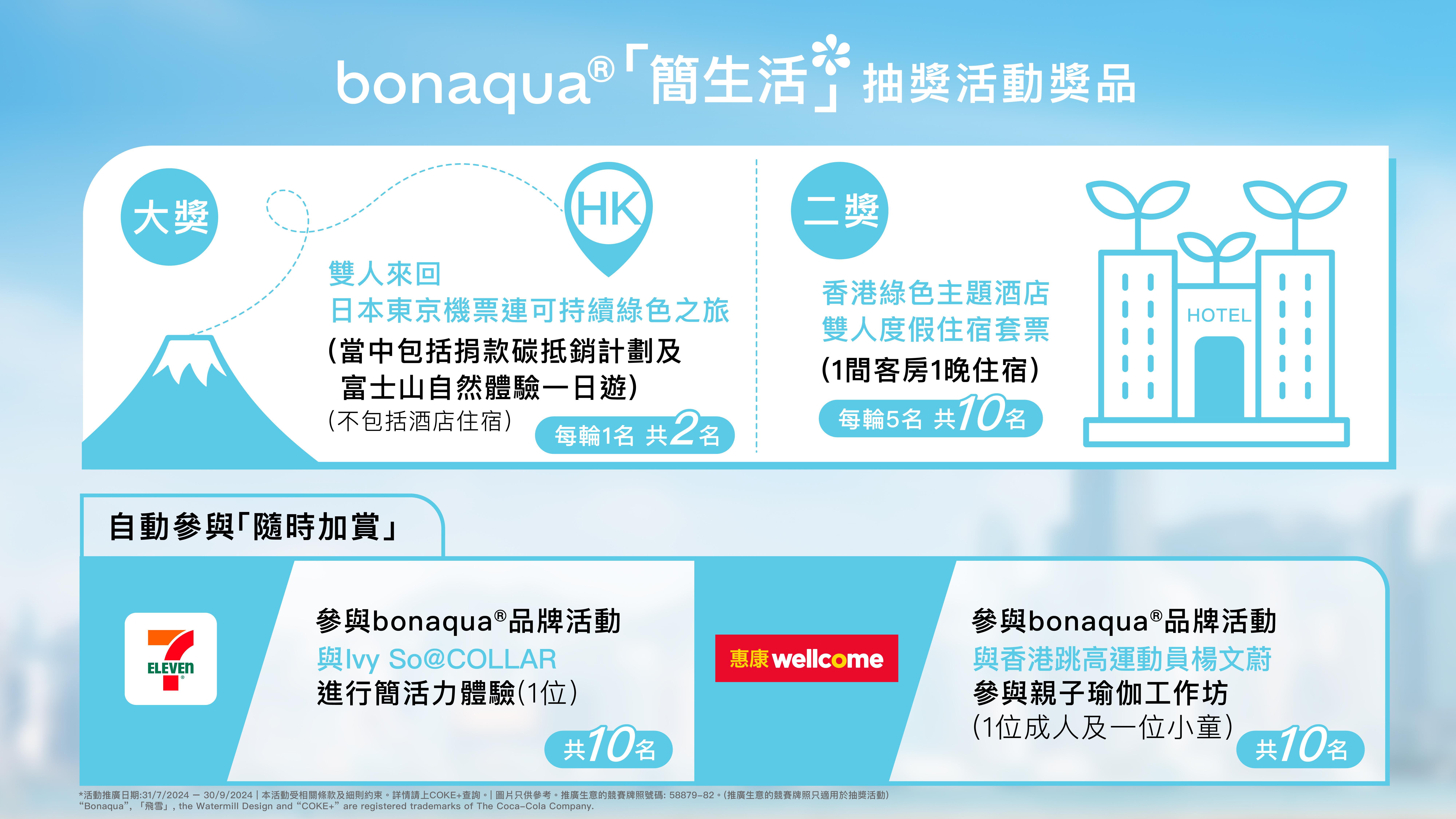 即日起至9月30日,於指定商戶購買任何bonaqua礦物質水產品滿$20或以上,登入或開立COKE+會員帳戶並上傳收據,即可參與「簡生活」大抽獎以及自動參與儲分計劃。