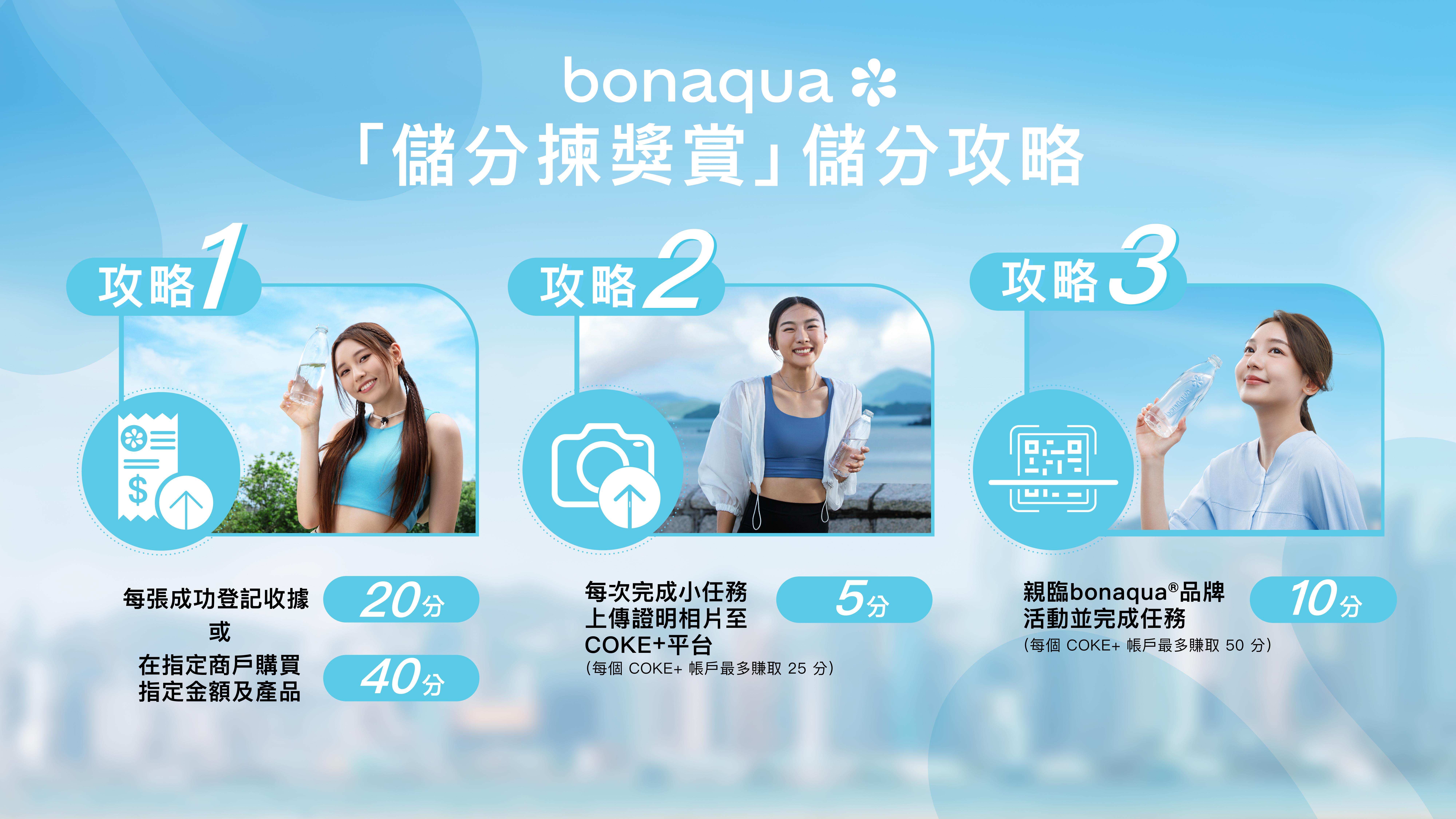 親臨 bonaqua品牌活動(活動詳情將於稍後公佈,密切留意官方消息)並完成任務即可獲專屬QR CODE,每完成一個任務即可獲得 10 分積分,每個 COKE+ 帳戶最多可賺取 50 分。