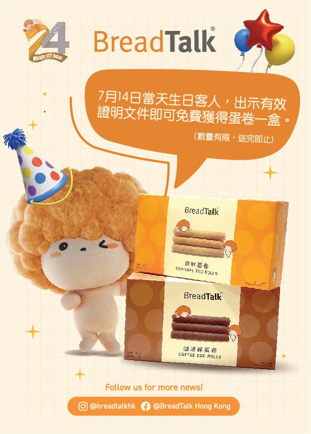7月14日生日正日當天,顧客只需出示有效證明文件,即可免費獲贈BreadTalk蛋卷(原味/咖啡味)一盒。數量有限,先到先得,送完即止。