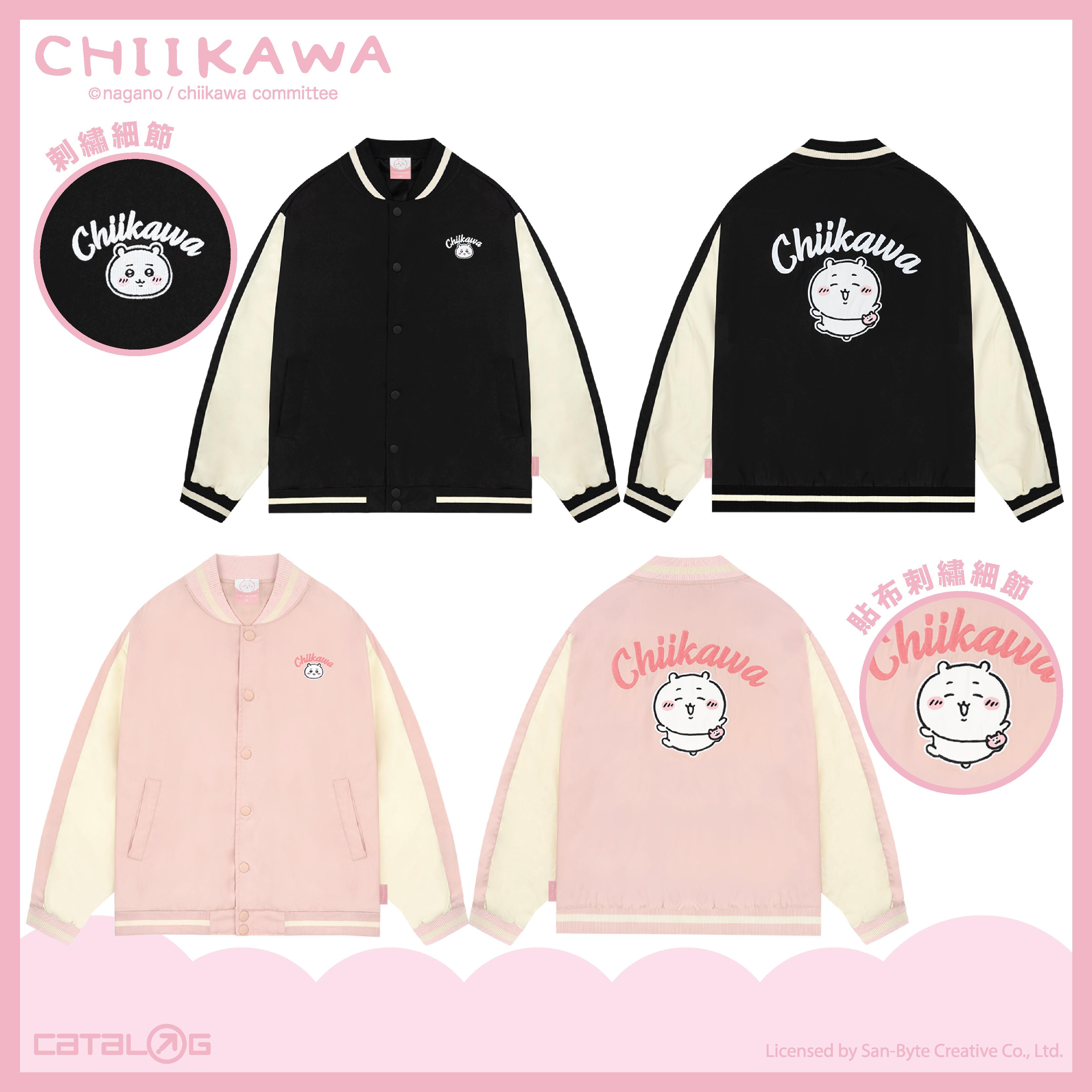 設計獨特的棒球褸備有黑色與粉紅色兩種選擇,兼具時尚感與活潑氣息,跑跳的CHIIKAWA圖案,為造型增添滿滿可愛元素。