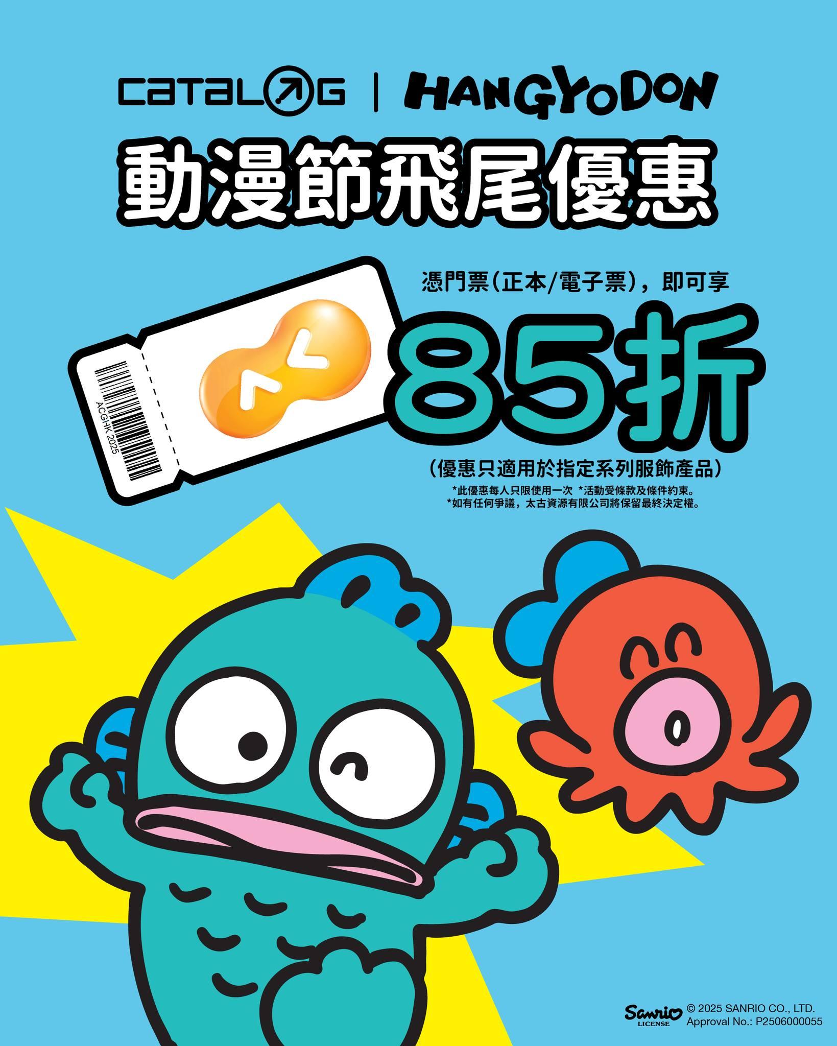 8月1日至8月31日期間,憑動漫節門票正本或電子票,即可到CATALOG全線門市,購買CATALOG X HANGYODON系列產品(襪除外),即享系列85折優惠。