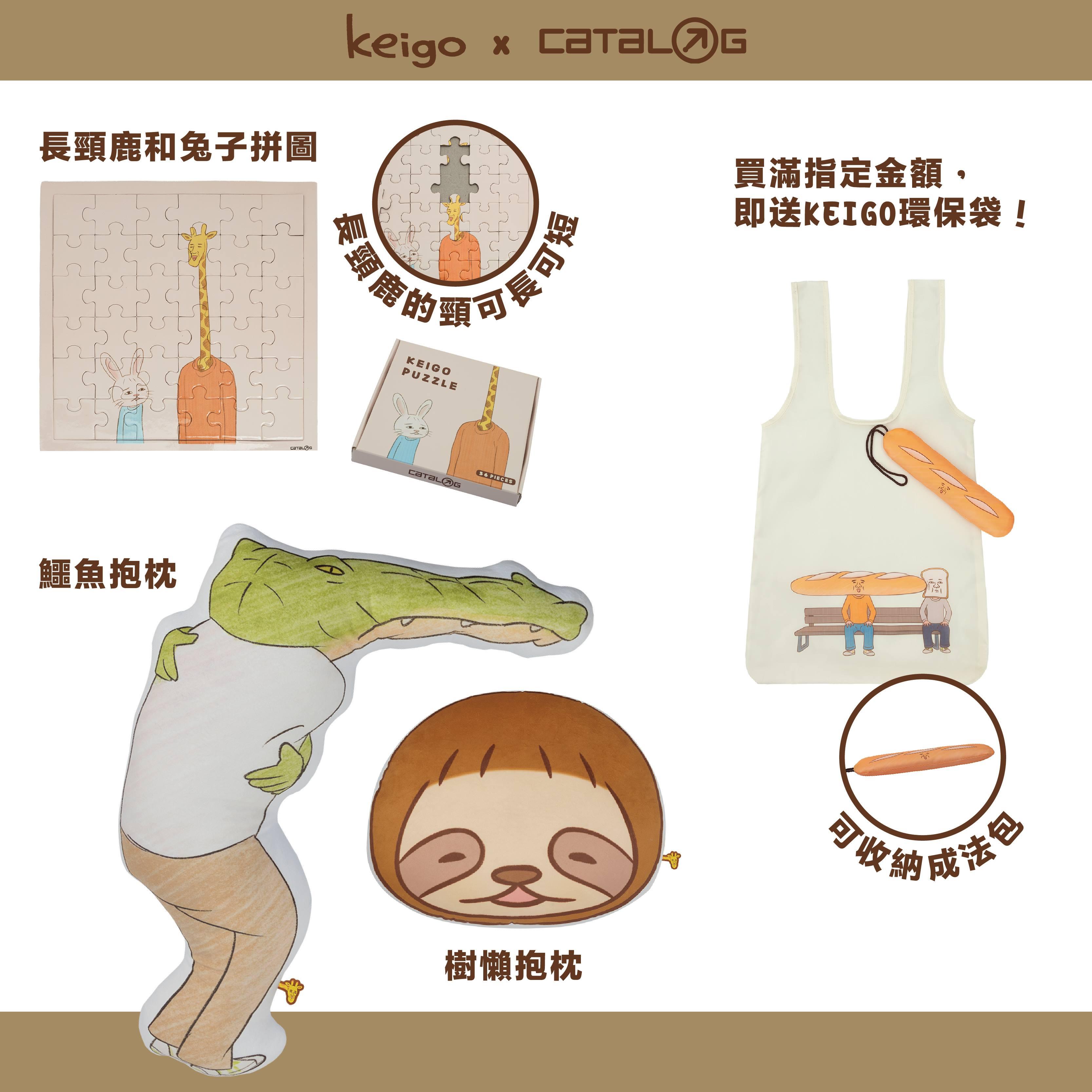 Catalog 更推出 Keigo 生活週邊商品,當中有長頸鹿漁夫帽、樹懶拖鞋,以及動物手機袋,款款都可愛又實用!Catalog 亦首次推出長頸鹿和兔子拼圖,可以隨意調整長頸鹿的頸部長度,增添了玩味性和趣味性。另外還有兩款抱枕,其中樹懶抱枕非常適合放在沙發上,陪伴你的休閒時間。而鱷魚自抱的抱枕靈感來自於鱷魚因嘴巴太長而無法與他人擁抱,只能自己抱緊的孤獨情景,現在你可以帶牠回家,給牠一點溫暖!