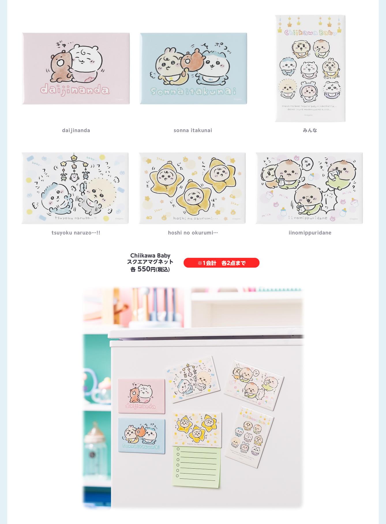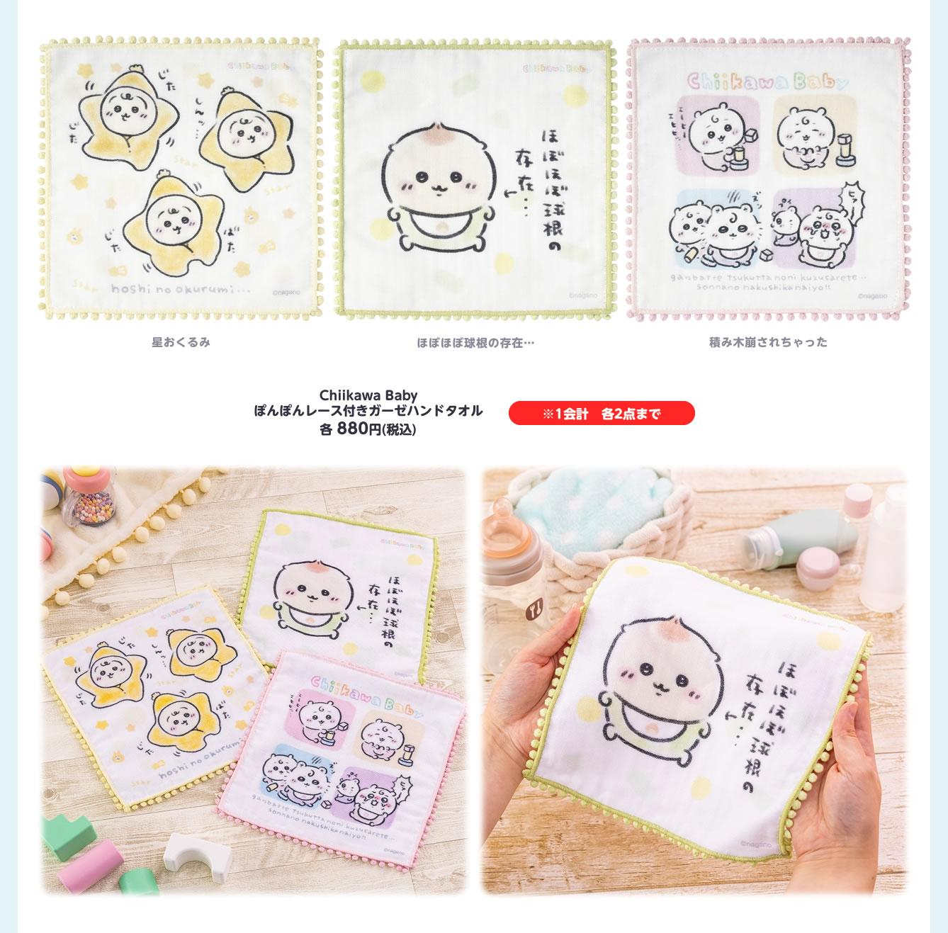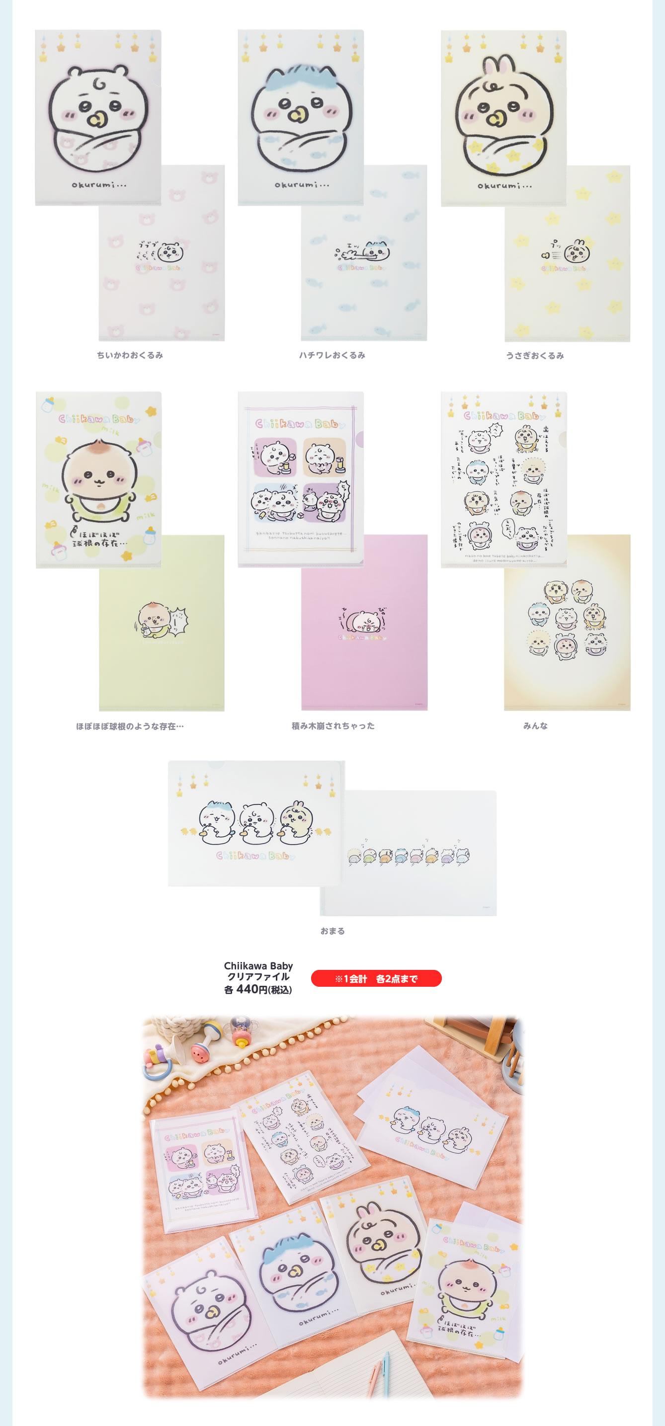 另外9月5日日本時間11:00起,官方網店將開賣首波「Chiikawa Baby」系列商品,只要於Chiikawa Market官方線上商店訂購3,300日幣(含稅)以上的商品,將會以「Chiikawa baby」特製BOX紙箱寄送,特製BOX共兩種尺寸,惟如果部分訂單商品太大或數量太多時,將有機會不會以「Chiikawa baby」特製BOX寄送。