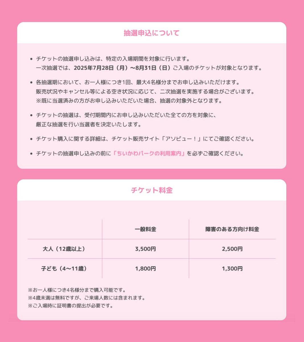 想第一時間入場Chiikawa Park,需要抽選才可入場。入場抽籤活動將為2025年7月28日至8月31日期間有意入場人士舉行,申請時間為2025年6月16日上午10:00至6月23日23:59。抽選入場登記需使用「アソビュー!」帳戶。每人最多可申請4張門票,每人限申請一次。