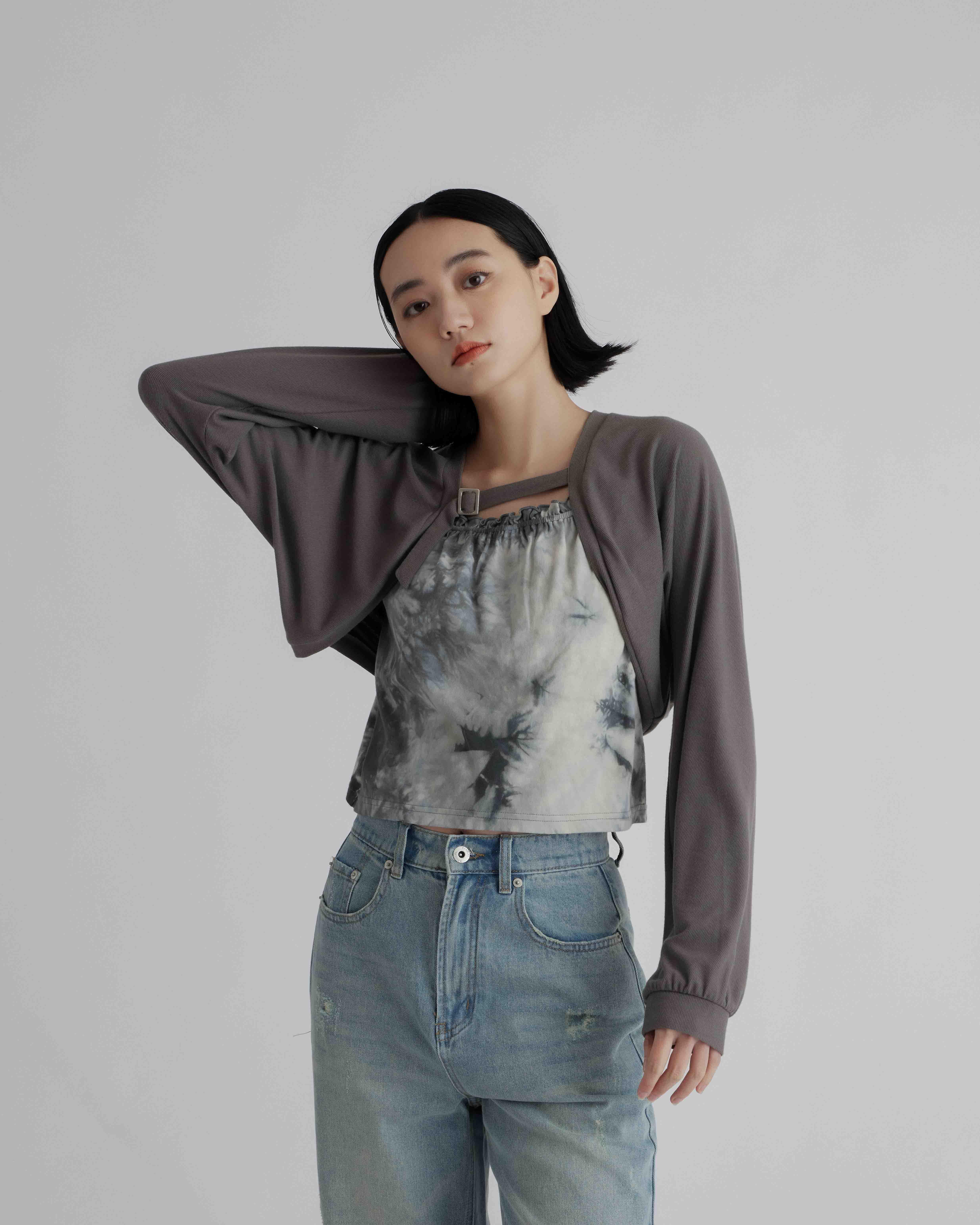 紮染元素的Tie Dye Top Twin-set,將初春必備的針織元素及流行的紮染布料融為一體,單色針織外套配上紮染背心,添上獨特風格及層次感。下身可配襯牛仔單品,突顯個人風格。備有灰、紫2色選擇。