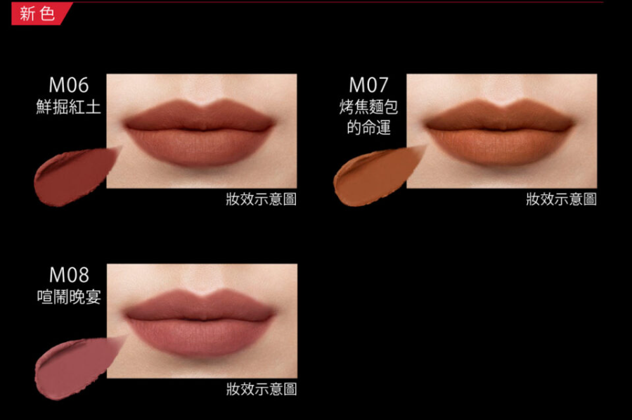M06是略深的紅棕色,能清楚勾勒雙唇輪廓,展現出優雅氛圍,暈開塗抹呈現時尚氛圍。