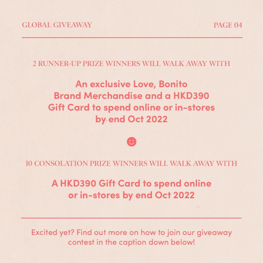 為配合全新標語主題,特別推出限量獨家系列,產品低調地印上Come Into Your Own標語,包括適合日常穿著的T恤、帽子和套頭長袖衫等。同時推出限時送禮活動,LB粉絲有機會贏取終極大獎 Love, Bonito VIP 通行證,將獲贊助航班、住宿及品牌購物禮券等,享受免費3日2夜新加坡360 Love, Bonito體驗之旅。另設多份Love, Bonito 購物禮券獎品,總價值超過港幣$189,600。
