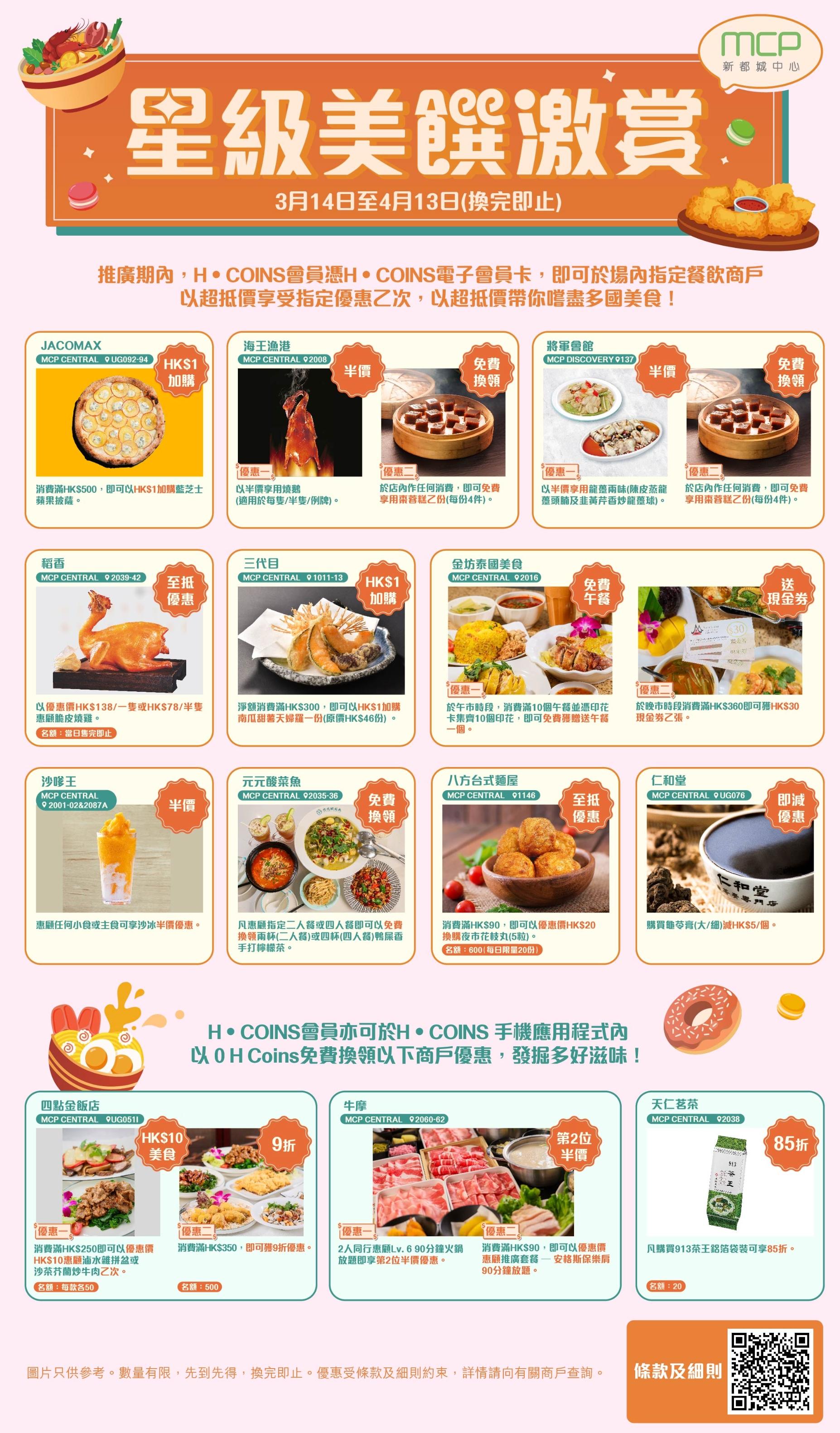 另外,H‧COINS會員於MCP CENTRAL & MCP DISCOVERY場內指定餐飲商戶單一消費滿$300,成功登記單據後即可獲電子印花1枚,集齊3枚電子印花可獲贈$50 MCP餐飲電子優惠券。會員如在指定商戶消費滿$1000,更可獲贈$100餐飲商戶優惠券。
