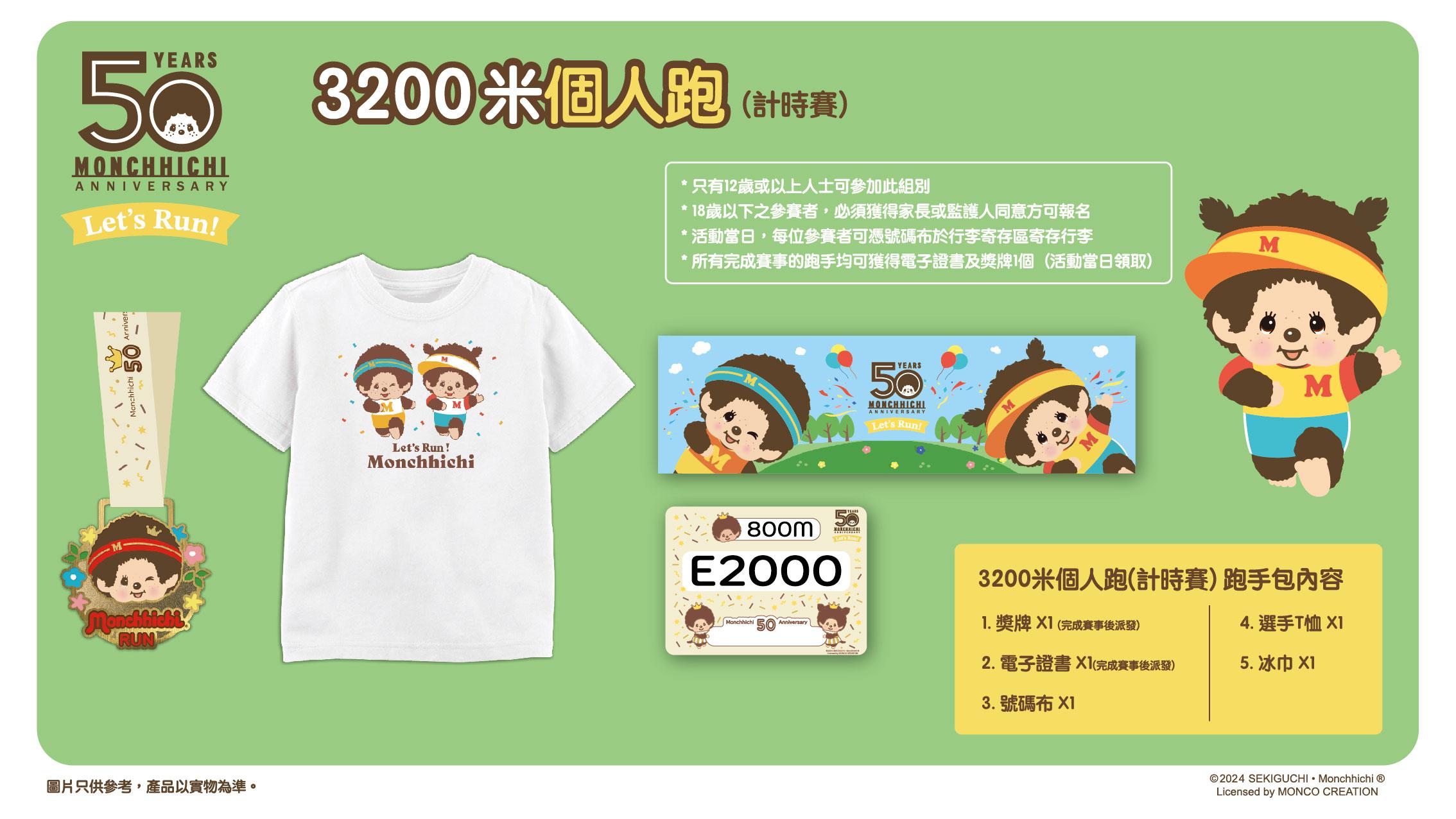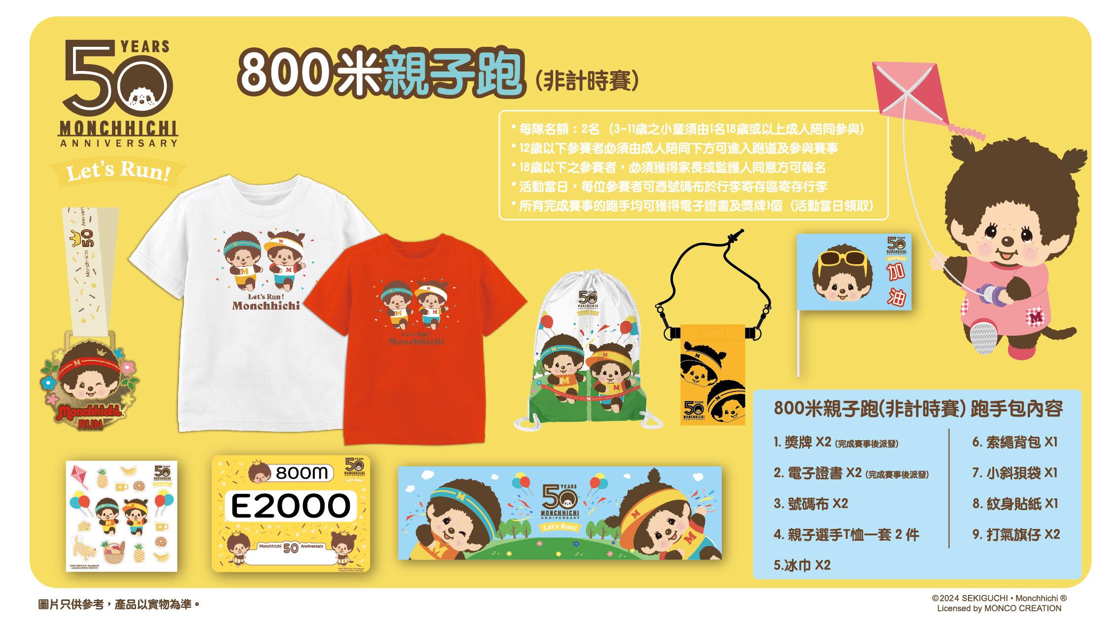 Monchhichi 50週年慶祝跑設有專業跑及FUN RUN兩大環節,共有個人計時跑為1.6及 3.2K、800M粉絲輕量跑及800M親子跑四個項目,適合不同年齡人士參加。活動特設2項Fun Run予個人及親子跑則為初試路跑的朋友及小朋友參加。屆時Monchhichi會換上運動服到場跟參加者打打氣,參加者有機會可以近距離跟Monchhichi拍照及互動,在跑步前後叉叉電。