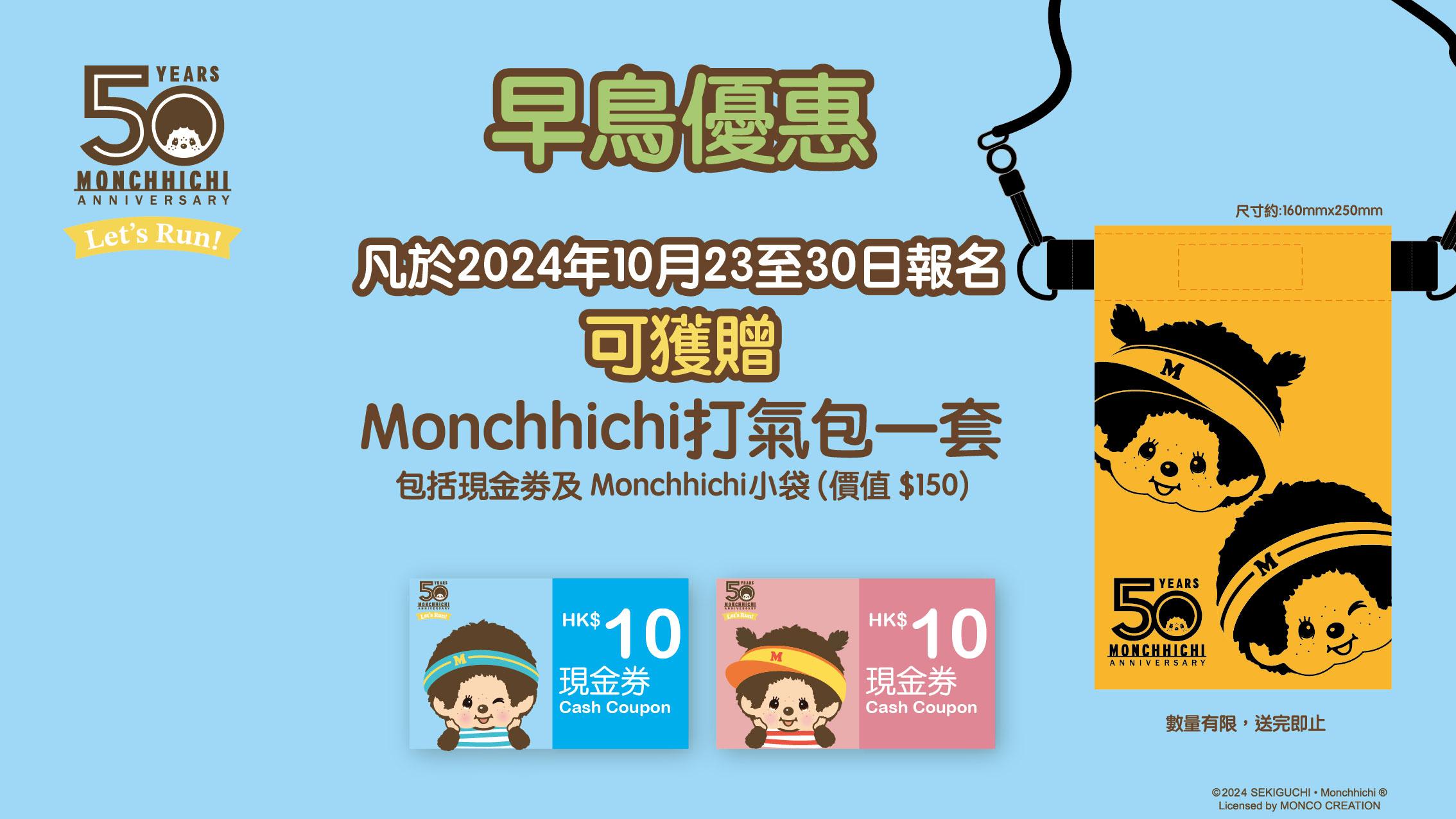 最受跑手期待的Monchhichi 50週年限定紀念品跑手包中,獨家使用的Monchhichi跑步造型素材,所有贈品附加了50週年logo以加強紀念性。每位參加慶祝跑的跑手均會獲贈跑手包,不同組別的跑手包會有所不同。所有組別跑手會獲贈T恤、冰巾及號碼布,當中附送的「限定獎牌」及電子證書附有官方授權50週年logo,單是紀念品零售價已達$400以上。由即日起至10月30日23:59成功在Klook報名參加慶祝跑,可享早鳥優惠贈品價值$150「限量版 Monchhichi 打氣包」,數量有限,送完即止。