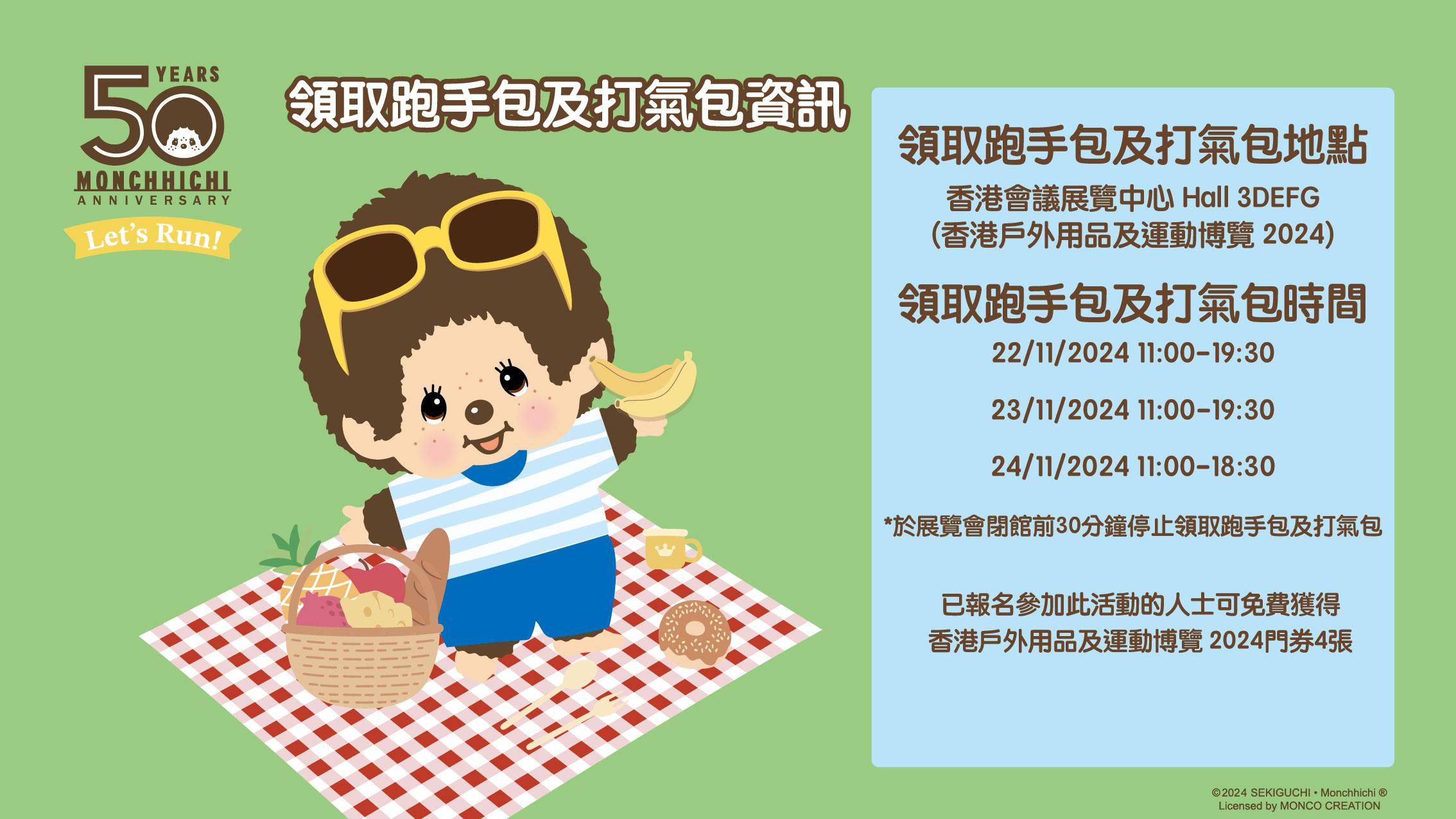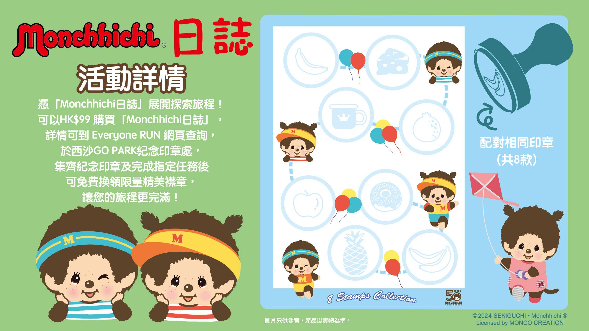 為慶祝Monchhichi誕生50週年,Everyone Run邀請Monchhichi換上運動裝走出戶外,與大小粉絲一起於西沙Go Park跑步。Monchhichi 50週年慶祝跑設有兩個組別,分別是專業跑及FUN RUN,適合不同年齡人士參加。參加慶祝跑活動附送的跑手包,獨家使用Monchhichi跑步造型素材,不同組別的跑手包會有不同紀念品,各具特色。同場更設尋印遊戲,在西沙Go Park不同地方集齊8個印章即可免費換領獎品。
