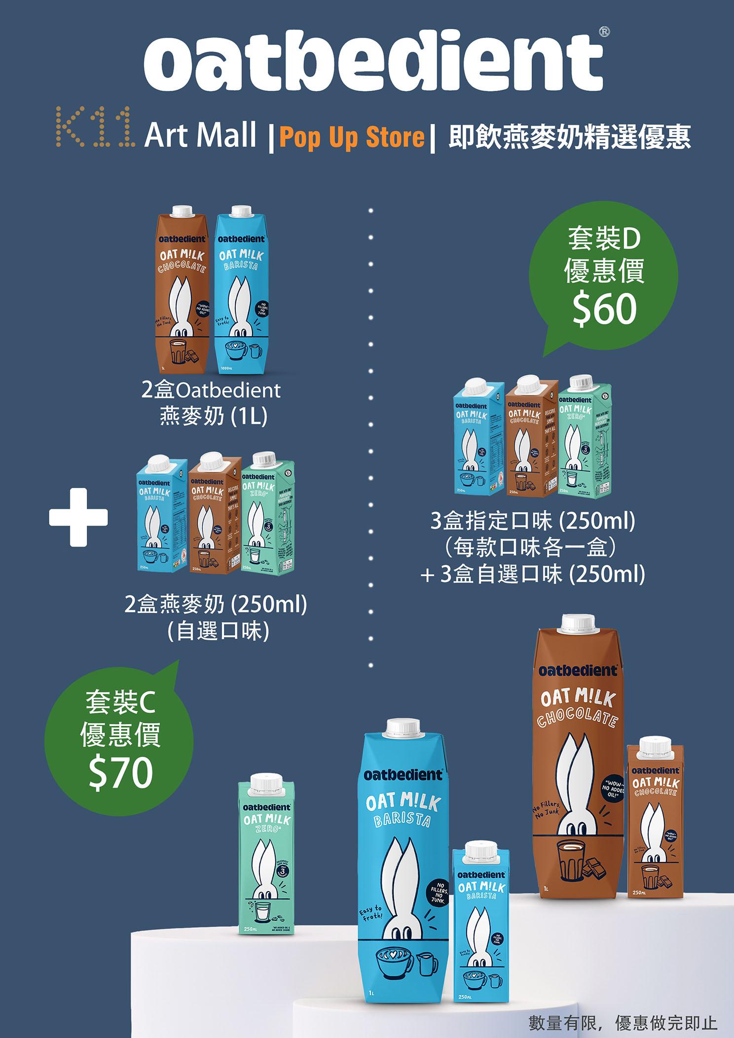 來自新加坡的人氣健康燕麥植物奶品牌Oatbedient為粉絲帶來首間香港POP-UP 快閃店,11月19日至12月2日進駐K11 Art Mall。快閃店有打卡位影靚相、有獎遊戲、特價優惠套裝,及全線系列產品發售,包括Oatbedient 即飲燕麥奶系列、Oatbedient即溶燕麥奶粉系列,及全新推出的Oatbedient即沖咖啡燕麥奶粉系列。Oatbedient產品全部不含防腐劑、人造色素、調味劑、樹膠、增稠劑、棕櫚油及奶精,更是純素及清真友善,迎合不同人士的需要:無論是熱愛運動的健身控、上班一族、莘莘學子、對飲食健康有要求,或是純粹需要方便快捷地補充營養的人也可得到滿足!